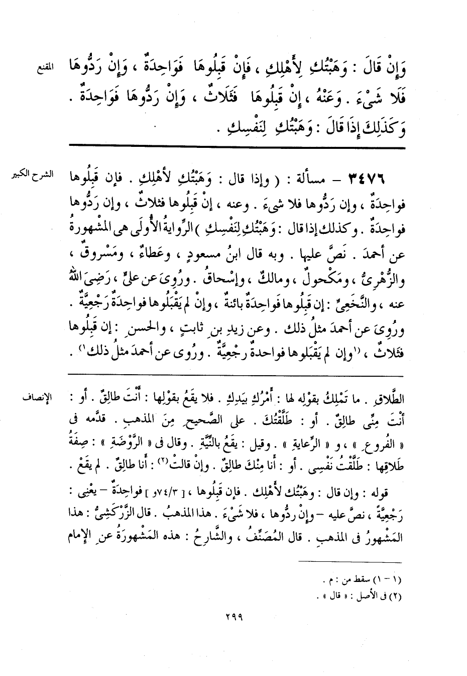 وَإِنْ قَالَ: وَهَبْتُكِ لِأهْلِكِ، فَإِنْ قَبِلُوهَا فَوَاحِدَةٌ، وَإِنْ رَدُّوهَا فَلَا شَىْءَ. وَعَنْهُ، إِنْ قَبِلُوهَا فَثَلَاثٌ، وَإِنْ رَدُّوهَا فَوَاحِدَةٌ. وَكَذَلِكَ إِذَا قَالَ: وَهَبْتُكِ لِنَفْسِكِ.