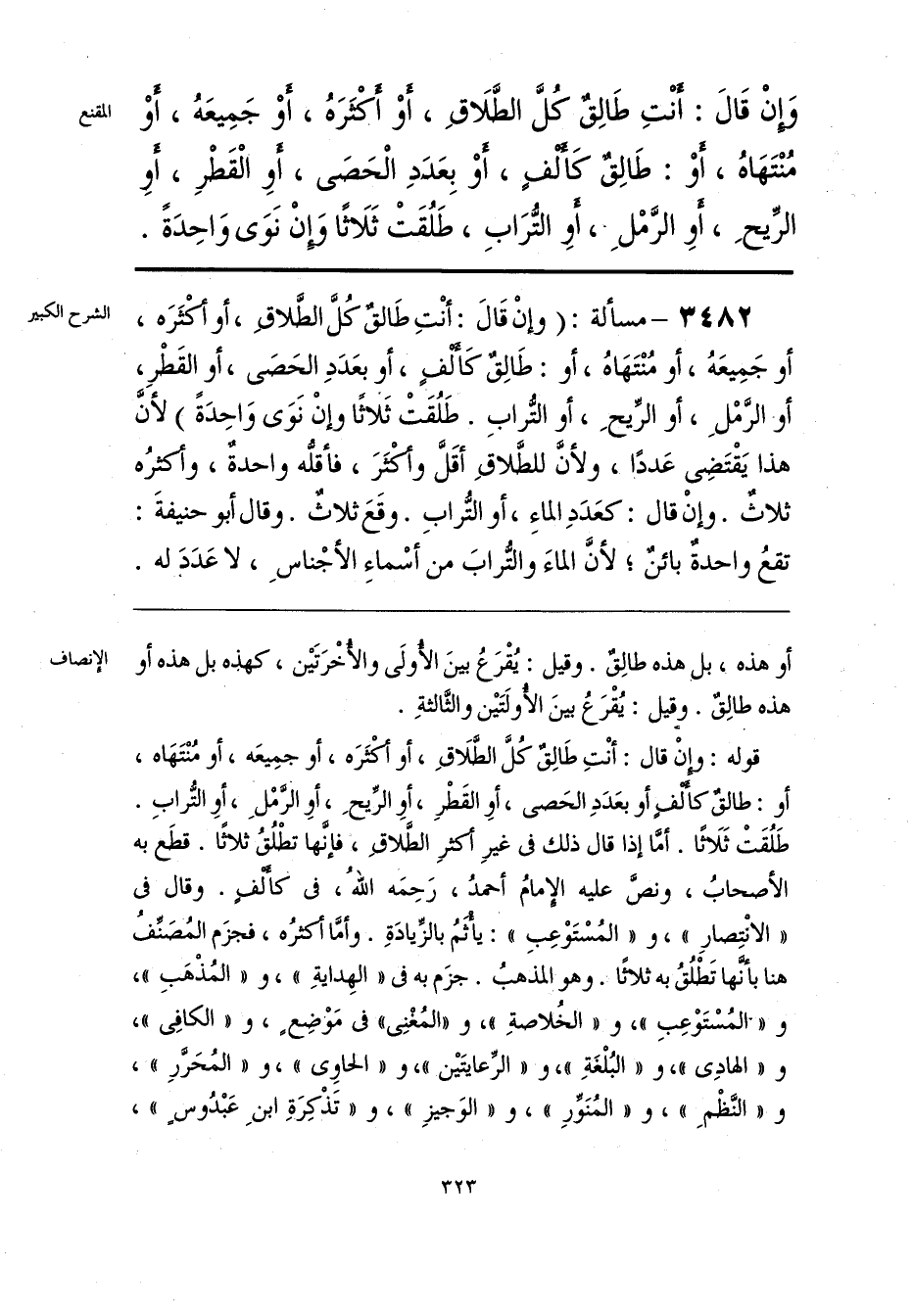 قوله: وإِنْ قال: أنْتِ طَالِقٌ كُلَّ الطَّلاقِ، أو أكْثَرَه، أو جمِيعَه، أو مُنْتَهَاه، أو: طالقٌ كأَلْفٍ أو بعَدَدِ الحَصى، أوِ القَطْرِ، أوِ الرِّيحِ، أوِ الرَّمْلِ، أوِ التُّرابِ. طَلُقَتْ ثَلَاثًا. أمَّا إذا قال ذلك فى غيرِ أكثرِ الطَّلاقِ، فإنَّها تطْلُقُ ثلاثًا. قطَع به الأصحابُ، ونصَّ عليه الإِمامُ أحمدُ، رَحِمَه اللَّهُ، فى كأَلْفٍ. وقال فى «الانْتِصارِ»، و «المُسْتَوْعِبِ»: يأْثَمُ بالزِّيادَةِ. وأمَّا أكثرُه، فجزَم المُصَنِّفُ هنا بأنَّها تَطْلُقُ به ثلاثًا. وهو المذهبُ. جزَم به فى «الهِدايَةِ»، و «المُذْهَبِ»، و «المُسْتَوْعِبِ»، و «الخُلاصةِ»، و «المُغْنِى» فى مَوْضِعٍ، و «الكافِى»، و «الهادِى»، و «البُلْغَةِ»، و «الرِّعايتَيْن»، و «الحاوِى»، و «المُحَرَّرِ»، و «النَّظْمِ»، و «المُنَوِّرِ»، و «الوَجيزِ»، و «تَذْكِرَةِ ابنِ عَبْدُوسٍ»،