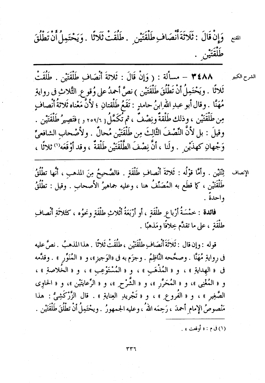 ثِنْتَيْن. وأمَّا قوْلُه: ثَلاثةَ أنْصافِ طَلْقَةٍ. فالصَّحيحُ مِنَ المذهبِ، أنَّها تطْلُقُ طَلْقَتَيْن, كما قطَع به المُصَنِّفُ هنا، وعليه جماهيرُ الأصحابِ. وقيل: تطْلُقُ واحدةً.