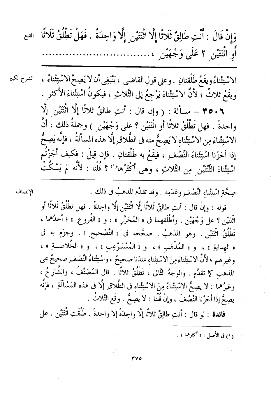 وَإِنْ قَالَ: أَنْتِ طَالِقٌ ثَلَاثًا إِلَّا اثْنَتَيْنِ إِلَّا وَاحِدَةً. فَهَلْ تَطْلُقُ ثَلَاثًا أَوِ اثْنَتَيْنِ؟ عَلَى وَجْهَيْنِ،