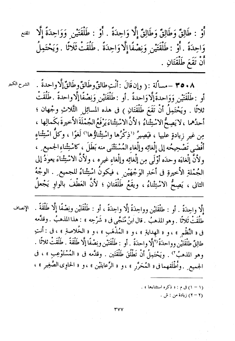 إلَّا واحِدَةً. أو: طلْقَتَيْن وواحِدَةً إلَّا واحِدَةً، أو: طَلْقَتَيْن ونِصْفًا إِلَّا طَلْقَةً. طلُقَتْ ثَلاثًا. وهو المذهبُ. قال ابنُ مُنَجَّى فى «شَرْحِه»: هذا المذهبُ. وقدَّمه فى «النَّظْمِ»، و «الهِدايَةِ»، و «المُذْهَبِ»، و «الخُلاصةِ»، فى: أنتِ طالِقٌ طلْقَتَيْن وواحدَةً [إلَّا واحدَةً. أو: طَلْقَتَيْن ونِصْفًا إلَّا طَلْقَةً. طَلُقَتْ ثَلاثًا. وهو المذهبُ] (¬1). ويَحْتَمِلُ أَنْ تَطْلُقَ طَلْقَتَين. وقدَّمه فى «المُسْتَوْعِبِ»، فى الجميعِ. وأطْلَقهما فى «المُحَرَّرِ»، و «الرِّعايَتَيْن»، و «الحاوِى الصَّغِيرِ»،