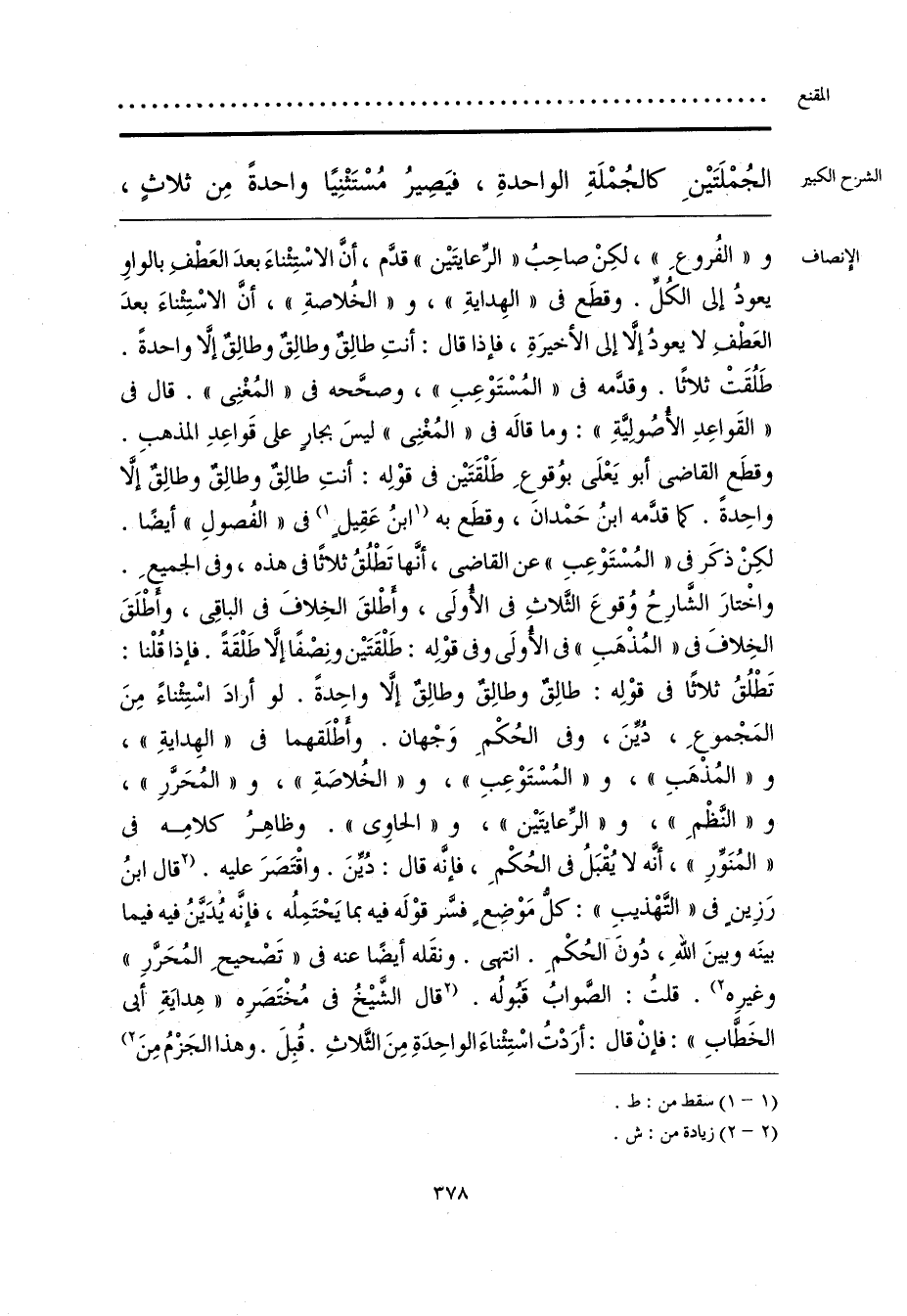 و «الفُروعِ»، لكِنْ صاحِبُ «الرِّعايتَيْن» قدَّم، أنَّ الاسْتِثْناءَ بعدَ العَطْفِ بالواوِ يعودُ إلى الكُلِّ. وقطَع فى «الهِدايَةِ»، و «الخُلاصةِ»، أنَّ الاسْتِثْناءَ بعدَ العَطْفِ لا يعودُ إلَّا إلى الأخيرَةِ، فإذا قال: أنتِ طالِقٌ وطالِقٌ وطالِقٌ إلَّا واحدةً. طَلُقَتْ ثلاثًا. وقدَّمه فى «المُسْتَوْعِبِ»، وصحَّحه فى «المُغْنِى». قال فى «القَواعِدِ الأُصُولِيَّةِ»: وما قالَه فى «المُغْنِى» ليسَ بجارٍ على قَواعِدِ المذهبِ. وقطَع القاضى أبو يَعْلَى بوُقوعِ طَلْقَتَيْن فى قوْلِه: أنتِ طالِقٌ وطالِقٌ وطالِقٌ إلَّا واحِدةً. كما قدَّمه ابنُ حَمْدانَ، وقطَع به [ابنُ عَقِيلٍ] (¬1) فى «الفُصولِ» أيضًا. لكِنْ ذكَر فى «المُسْتَوْعِبِ» عن القاضى، أنَّها تَطْلُقُ ثلاثًا فى هذه، وفى الجميعِ. واخْتارَ الشَّارِحُ وُقوعَ الثَّلاثِ فى الأُولَى، وأَطْلقَ الخِلافَ فى الباقِى، وأَطْلَقَ الخِلافَ فى «المُذْهَبِ» فى الأُولَى وفى قوْلِه: طَلْقَتَيْن ونِصْفًا إلَّا طَلْقَةً. فإذا قُلْنا: تَطْلُقُ ثلاثًا فى قوْلِه: طالِقٌ وطالِقٌ وطالِقٌ إلَّا واحِدةً. لو أرادَ اسْتِثْناءً مِنَ المَجْموعِ، دُيِّنَ، وفى الحُكْمِ وَجْهان. وأطْلَقهما فى «الهِدايَةِ»، و «المُذْهَبِ»، و «المُسْتَوْعِبِ»، و «الخُلاصَةِ»، و «المُحَرَّرِ»، و «النَّظْمِ»، و «الرِّعايتَيْن»، و «الحاوِى». وظاهِرُ كلامِه فى «المُنَوِّرِ»، أنَّه لا يُقْبَلُ فى الحُكْمِ، فإنَّه قال: دُيِّنَ. واقْتَصَرَ عليه. [قال ابنُ رَزِينٍ فى «التَّهْذيبِ»: كلُّ مَوْضِعٍ فسر قوْلَه فيه بما يَحْتَمِلُه، فإنَّه يُدَينُ فيه فيما بينَه وبينَ اللَّهِ، دُونَ الحُكْمِ. انتهى. ونقَله أيضًا عنه فى «تَصْحيحِ المُحَرَّرِ» وغيرِه] (2). قلتُ: الصَّوابُ قَبُولُه. [قال الشَّيْخُ فى مُخْتَصَرِه «هِدايَةِ أبى الخَطَّابِ»: فإنْ قال: أرَدْتُ اسْتِثْناءَ الواحِدَةِ مِنَ الثَّلاثِ. قُبِلَ. وهذا الجَزْمُ مِنَ] (¬2)