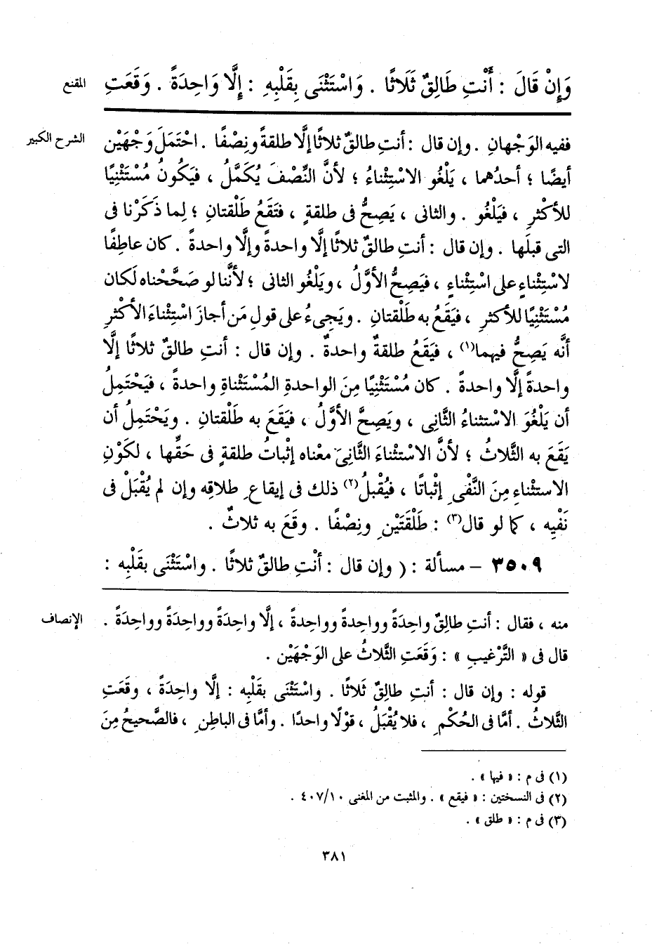 منه، فقال: أنتِ طالِقٌ واحِدَةً وواحِدةً وواحِدةً، إلَّا واحِدَةً وواحِدَةً وواحِدَةً. قال فى «التَّرْغيبِ»: وَقَعَتِ الثَّلاثُ على الوَجْهَيْن.