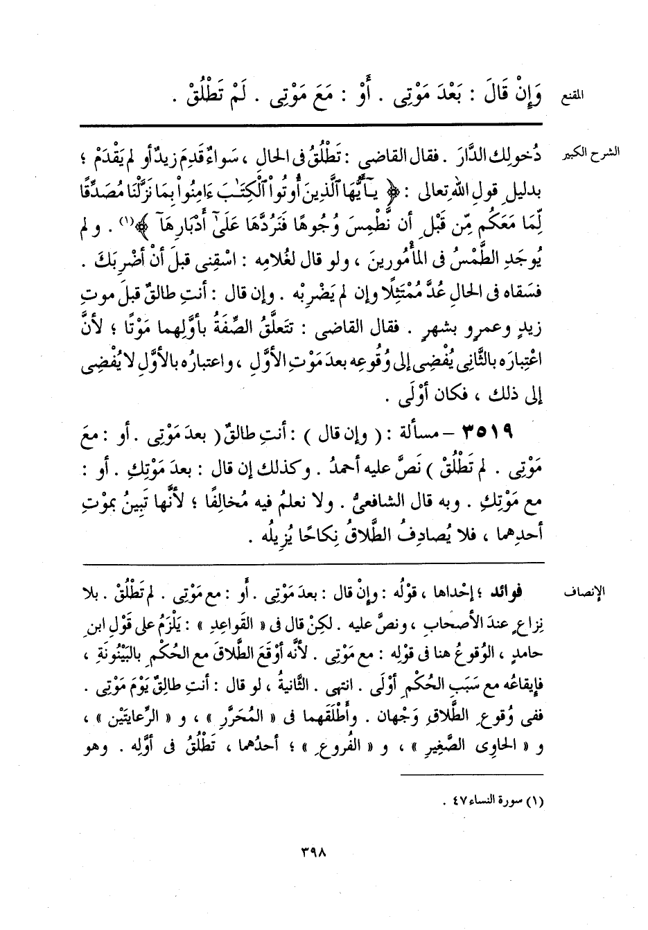فوائد؛ إحْداها، قوْلُه: وإنْ قال: بعدَ مَوْتِي. أَو: مع مَوْتِي. لم تَطْلُقْ. بلا نِزاعٍ عندَ الأصحابِ، ونصَّ عليه. لكِنْ قال في «القَواعِدِ»: يَلْزَمُ على قَوْلِ ابنِ حامدٍ، الوُقوعُ هنا في قوْلِه: مع مَوْتِي. لأنَّه أوْقَعَ الطَّلاقَ مع الحُكْمِ بالبَينُونَةِ، فإيقاعُه مع سَبَبِ الحُكْمِ أوْلَى. انتهى. الثَّانيةُ، لو قال: أنتِ طالِق يَوْمَ مَوْتِي. ففي وُقوعِ الطَّلاقِ وَجْهان. وأَطْلَقَهما في «المُحَرَّرِ»، و «الرِّعايتَين»، و «الحاوي الصَّغِيرِ»، و «الفُروعِ»؛ أحدُهما، تَطْلُقُ في أوَّلِه. وهو