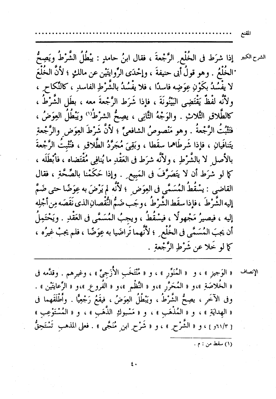 «الوَجيزِ»، و «المُنَوِّرِ»، و «مُنْتَخَبِ الأَزَجِىِّ»، وغيرِهم. وقدَّمه فى «الخُلاصَةِ»، و «المُحَرَّرِ»، و «النَّظْمِ»، و «الفُروعِ»، و «الرِّعايتَيْن». وفى الآخَرِ، يصِحُّ الشَّرْطُ، ويَبْطُلُ العِوَضُ، فيقَعُ رَجْعِيًّا. وأَطْلَقَهما فى «الهِدايَةِ»، و «المُذْهَبِ»، و «مَسْبوكِ الذَّهَبِ»، و «المُسْتَوْعِبِ»، و «الشَّرْحِ»، و «شَرْحِ ابنِ مُنَجَّى». فعلى المذهبِ تَسْتَحِقُّ