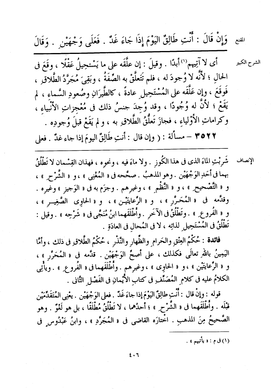 شَرِبْتِ الماءَ الذي في هذا الكُوزِ. ولا ماءَ فيه، ونحوه، فهذان القِسْمان لا تَطْلُقُ بهما في أحَدِ الوَجْهَين. وهو المذهبُ. صحَّحه في «المُغْنِي»، و «الشَّرْحِ»، و «التَّصْحيحِ»، و «النَّظْمِ»، وغيرِهم. وجزَم به في «الوَجيزِ» وغيرِه. وقدَّمه في «المُحَرَّرِ»، و «الرِّعايتَين»، و «الحاوي الصَّغِيرِ»، و «الفُروعِ». وتَطْلُقُ في الآخَرِ. وأَطْلَقَهما ابنُ مُنَجَّى في «شَرْحِه». وقيل: تَطْلُقُ في المُسْتَحِيلِ لذاتِه، لا في المُحالِ في العادَةِ.