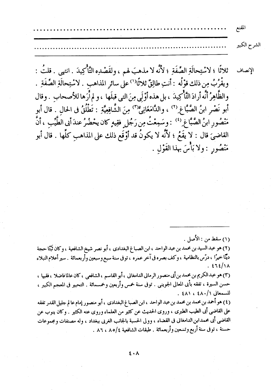 (¬4) هو أحمد بن محمد بن محمد بن عبد الواحد، ابن الصباغ البغدادي، أبو منصور إمام عالم جليل القدر تفقه على القاضي أبي الطيب الطبري، وروى الحديث عن كثير من العلماء وروى عنه الكثير. وكان ينوب عن القاضي أبي محمد بن الدامغاني في القضاء، وولي الحسبة بالجانب الغربي ببغداد، وله مصنفات ومجموعات حسنة، توفي سنة أربع وتسعين وأربعمائة. طبقات الشافعية 4/ 85، 86.