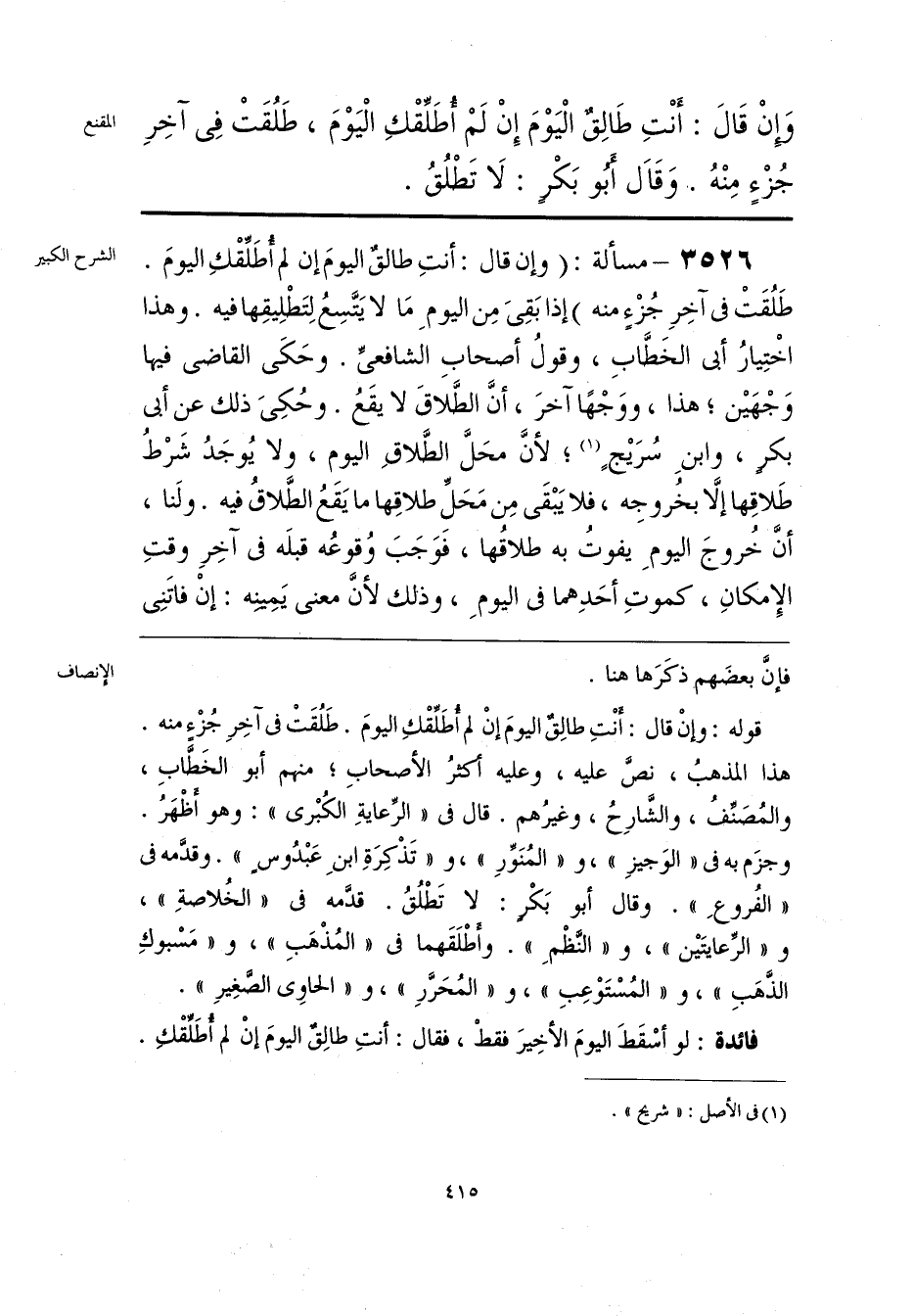 قوله: وإنْ قال: أَنْتِ طالِقٌ اليومَ إنْ لم أُطَلِّقْكِ اليومَ. طَلُقَتْ في آخِرِ جُزْءٍ منه. هذا المذهبُ، نصَّ عليه، وعليه أكثرُ الأصحابِ؛ منهم أبو الخَطَّابِ، والمُصَنِّفُ، والشَّارِحُ، وغيرُهم. قال في «الرِّعايةِ الكُبْرى»: وهو أَظْهَرُ. وجزَم به في «الوَجيزِ»، و «المُنَوِّر»، و «تَذْكِرَةِ ابنِ عَبْدُوسٍ». وقدَّمه في «الفُروعِ». وقال أبو بَكْرٍ: لا تَطْلُقُ. قدَّمه في «الخُلاصةِ»، و «الرِّعايتَين»، و «النَّظْمِ». وأَطْلَقَهما في «المُذْهبِ»، و «مَسْبوكِ الذَّهَبِ»، و «المُسْتَوْعِبِ»، و «المُحَرَّرِ»، و «الحاوي الصَّغِيرِ».