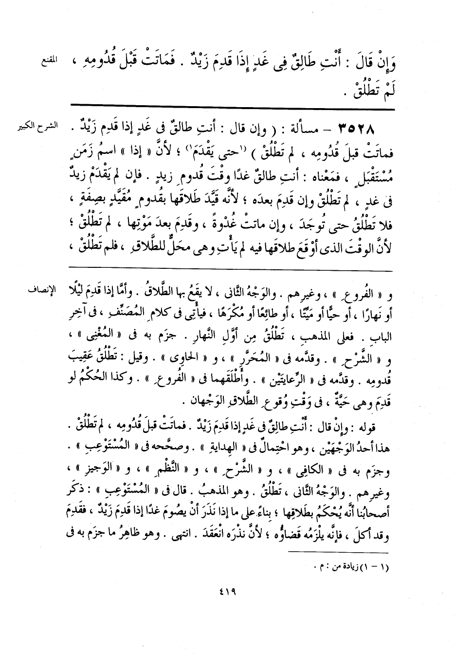 و «الفُروعِ»، وغيرِهم. والوَجْهُ الثَّاني، لا يقَعُ بها الطَّلاقُ. وأمّا إذا قَدِمَ ليلًا أو نَهارًا، أو حيًّا أو مَيِّتًا، أو طائِعًا أو مُكْرَهًا، فيأْتِي في كلامِ المُصَنِّفِ، في آخِرِ البابِ. فعلى المذهبِ، تَطْلُقُ مِن أوَّلِ النَّهارِ. جزَم به في «المُغْنِي»، و «الشَّرْحِ». وقدَّمه في «المُحَرَّرِ»، و «الحاوي». وقيل: تَطْلُقُ عَقِيبَ قُدومِه. وقدَّمه في «الرِّعايتَين». وأَطْلَقَهما في «الفُروعِ». وكذا الحُكْمُ لو قَدِمَ وهي حَيَّةٌ، في وَقْتِ وُقوعِ الطَّلاقِ الوَجْهان.