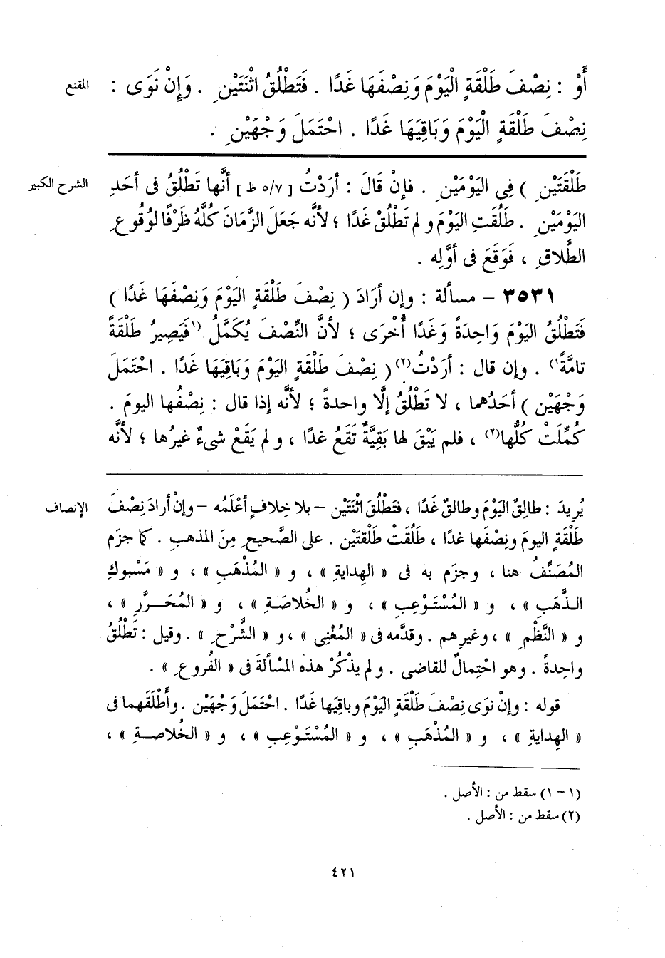 قوله: وإنْ نوَى نِصْفَ طَلْقَةٍ اليَوْمَ وباقِيَها غَدًا. احْتَمَلَ وَجْهَين. وأَطْلَقَهما في «الهِدايةِ»، و «المُذْهبِ»، و «المُسْتَوْعِبِ»، و «الخُلاصةِ»،