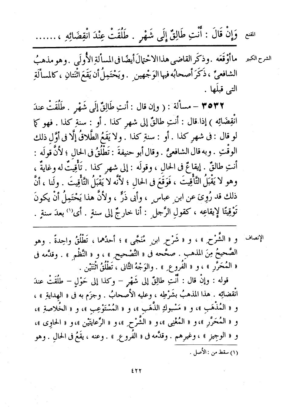 قوله: وإنْ قال: أَنْتِ طالِقٌ إلى شَهْرٍ -وكذا إلى حَوْلٍ- طلُقَتْ عندَ انْقضائِه. هذا المذهبُ بشَرْطِه، وعليه الأصحابُ. وجزَم به في «الهِدايةِ»، و «المُذْهبِ»، و «مَسْبوكِ الذَّهبِ»، و «المُسْتَوْعِبِ»، و «الخُلاصةِ»، و «المُحَرَّرِ»، و «المُغْنِي»، و «الشَّرْحِ»، و «الرِّعايتَين»، و «الحاوي»، و «الوجِيزِ»، وغيرِهم. وقدَّمه في «الفُروعِ». وعنه، يقَعُ في الحالِ. وهو