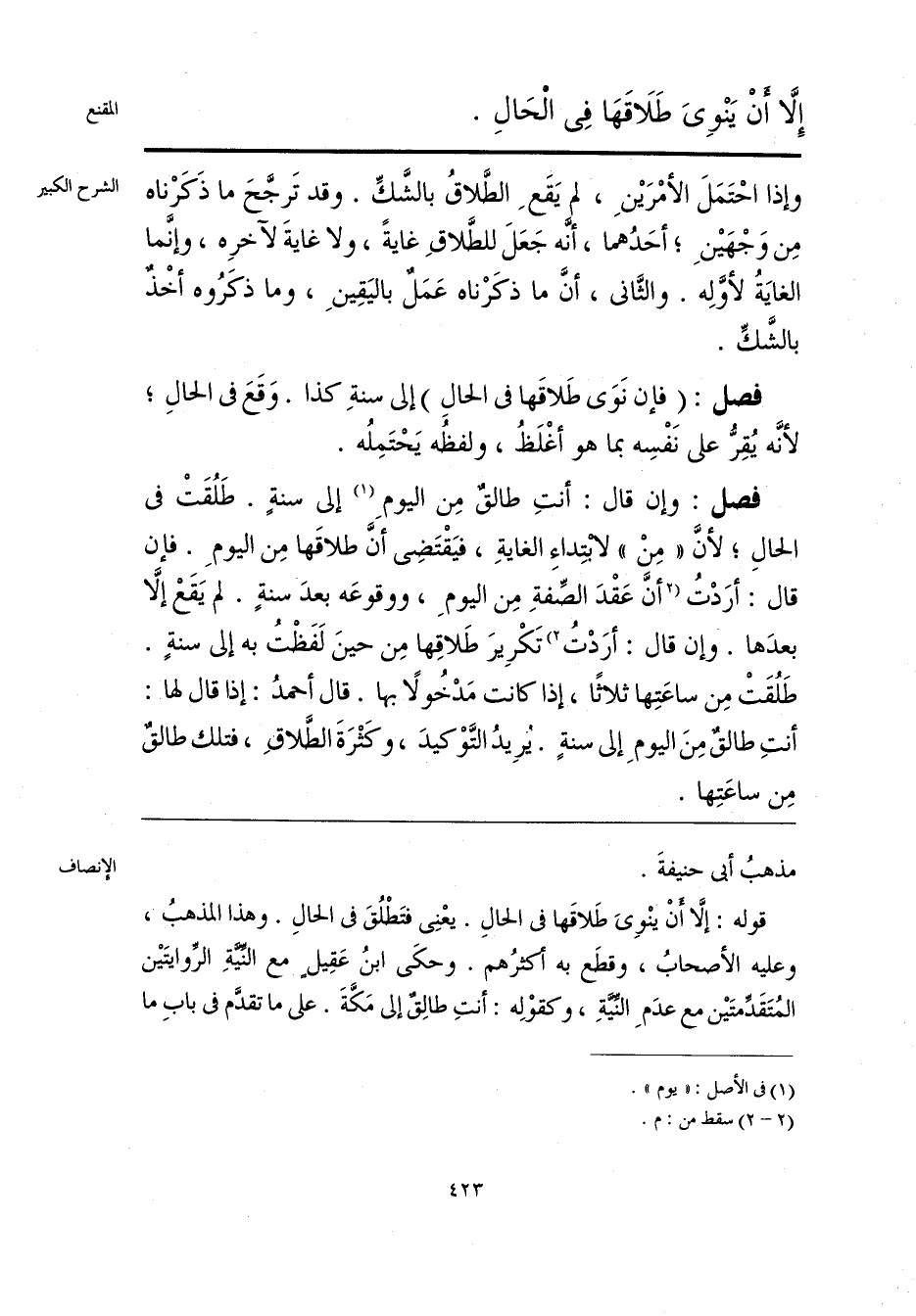 قوله: إلَّا أنْ ينْوِيَ طَلاقَها في الحالِ. يعْنِي فتَطْلُقَ في الحالِ. وهذا المذهبُ، وعليه الأصحابُ، وقطَع به أكثرُهم. وحكَى ابنُ عَقِيلٍ مع النِّيَّةِ الرِّوايتَين المُتَقَدِّمتَين مع عدَمِ النَّيَّةِ، وكقوْلِه: أنتِ طالِقٌ إلى مَكَّةَ. على ما تقدَّم في بابِ ما