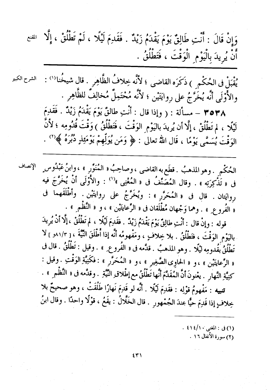 وَإنْ قَال: أَنْتِ طَالِقٌ يَوْمَ يَقْدَمُ زَيدٌ. فَقَدِمَ لَيلًا، لَمْ تَطْلُقْ، إلا أَنْ يُرِيدَ بِالْيَوْمِ الْوَقْتَ، فَتَطْلُقُ.