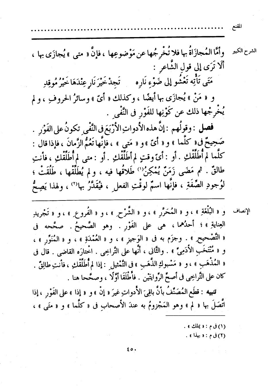 و «البُلْغَةِ»، و «المُحَرَّرِ»، و «الشَّرْحِ»، و «الفُروعِ»، و «تَجْريدِ العِنايةِ»؛ أحدُهما، هي على الفَوْرِ. وهو الصَّحيحُ. صحَّحه في «التَّصْحيحِ». وجزَم به في «الوَجيزِ»، و «العُمْدَةِ»، و «المُنَوِّرِ»، و «مُنْتَخَبِ الأدَمِيِّ». والثَّاني، أنَّها على التَّراخِي. اخْتارَه القاضي. قال في «المُذْهَبِ»، و «مَسْبوكِ الذَّهَبِ» في التَّمْثيلِ: إذا لم أُطَلِّقْكِ، فأنتِ طالِقٌ. كان على التَّراخِي في أصحِّ الرِّوايتَين. فأَطْلَقَا أولًا، وصحَّحا هنا.
