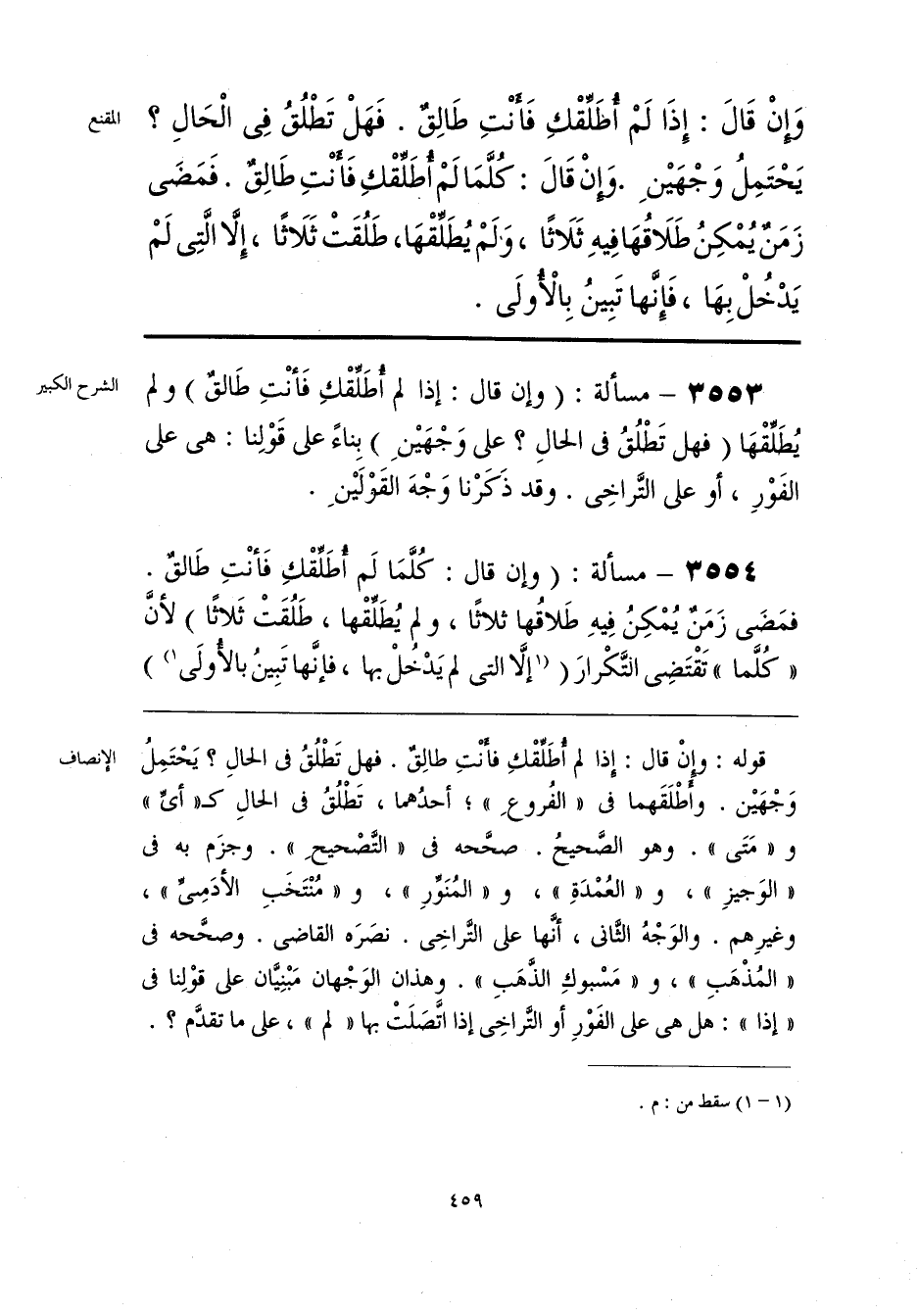 قوله: وإن قال: إذا لم أُطَلِّقْكِ فأَنْتِ طالِقٌ. فهل تَطْلُقُ في الحالِ؟ يَحْتَمِلُ وَجْهَين. وأَطْلَقَهما في «الفُروعِ»؛ أحدُهما، تَطْلُقُ في الحالِ كـ «أيِّ» و «مَتَى». وهو الصَّحيحُ. صحَّحه في «التَّصْحيحِ». وجزَم به في «الوَجيزِ»، و «العُمْدَةِ»، و «المُنَوِّرِ»، و «مُنْتَخَبِ الأدَمِيِّ»، وغيرِهم. والوَجْهُ الثَّاني، أنَّها على التَّراخِي. نصَرَه القاضي. وصحَّحه في «المُذْهَبِ»، و «مَسْبوكِ الذَّهَبِ». وهذان الوَجْهان مَبْنِيَّان على قوْلِنا في «إذا»: هل هي على الفَوْرِ أو التَّراخِي إذا اتَّصَلَتْ بها «لم»، على ما تقدَّم؟.