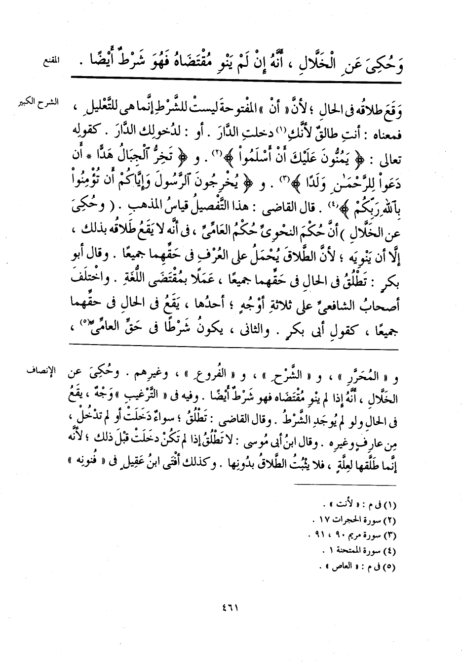 و «المُحَرَّرِ»، و «الشَّرْحِ»، و «الفُروعِ»، وغيرِهم. وحُكِيَ عن الخَلّالِ، أَنَّهُ إذا لم ينْو مُقْتَضَاه فهو شَرْطٌ أيضًا. وفيه في «التَّرْغيبِ» وَجْهٌ، يقَعُ في الحالِ ولو لم يُوجَدِ الشّرْطُ. وقال القاضي: تَطْلُقُ؛ سواءٌ دَخَلَتْ أو لم تدْخُلْ، مِن عارِفٍ وغيرِه. وقال ابنُ أبي مُوسى: لا تَطْلُقُ إذا لم تَكُنْ دخَلَتْ قبْلَ ذلك؛ لأنَّه إنَّما طَلَّقها لعِلَّةٍ، فلا يثْبُتُ الطَّلاقُ بدُونِها. وكذلك أفْتَى ابنُ عَقِيلٍ في «فُنونِه»
