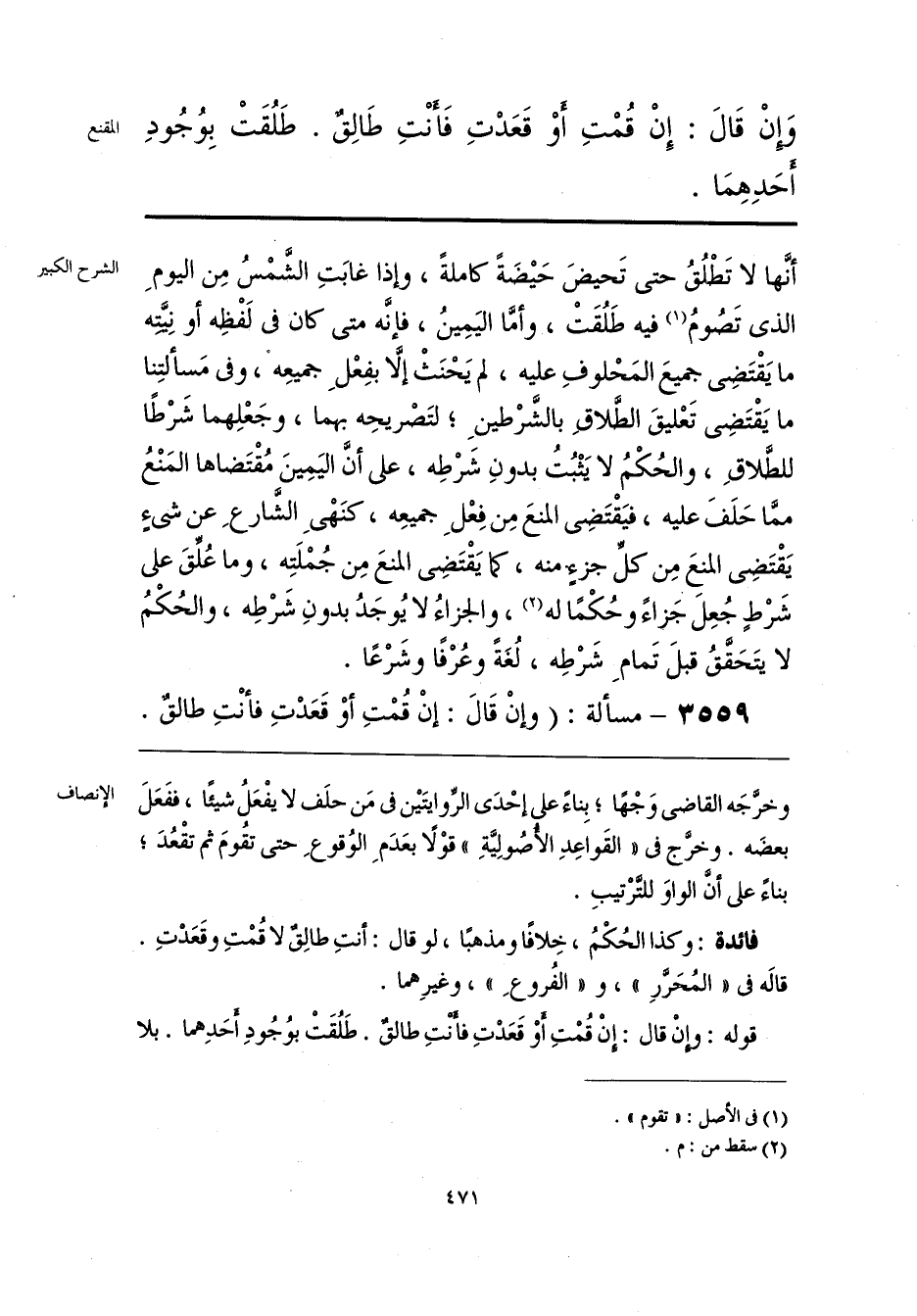 فائدة: وكذا الحُكْمُ، خِلافًا ومذهبًا، لو قال: أنتِ طالِقٌ لا قُمْتِ وقَعَدْتِ. قاله في «المُحَرَّرِ»، و «الفُروعِ»، وغيرِهما.