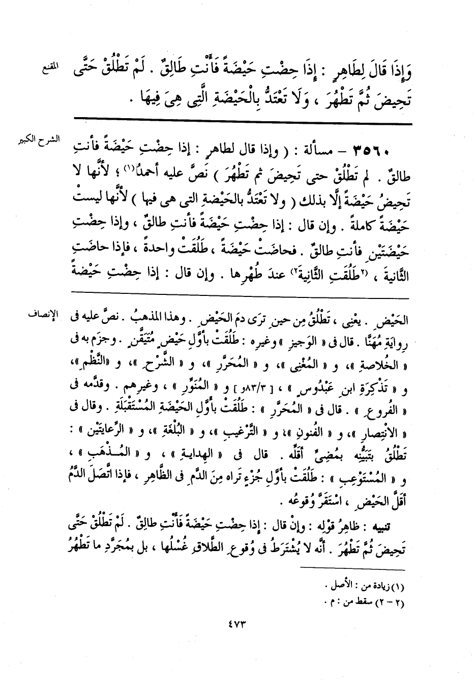 الحَيضِ. يعْنِي، تَطْلُقُ مِن حينِ ترَى دمَ الحَيضِ. وهذا المذهبُ. نصَّ عليه في رِوايَةِ مُهَنَّا. قال في «الوَجيزِ» وغيرِه: طَلُقَتْ بأوَّلِ حَيضٍ مُتَيَقَّنٍ. وجزَم به في «الخُلاصةِ»، و «المُغْنِي»، و «المُحَرَّرِ»، و «الشَّرْحِ»، و «النَّظْمِ»، و «تَذْكِرَةِ ابنِ عَبْدُوسٍ»، و «المُنَوِّرِ»، وغيرِهم. وقدَّمه في «الفُروعِ». قال في «المُحَرَّرِ»: طَلُقَتْ بأَوَّلِ الحَيضَةِ المُسْتَقْبَلَةِ. وقال في «الانْتِصارِ»، و «الفُنونِ»، و «التَّرْغيبِ»، و «البُلْغَةِ»، و «الرِّعايتَين»: تَطْلُقُ بتَبَيُّنِه بمُضِيِّ أقَلِّه. قال في «الهِدايةِ»، و «المُذْهَبِ»، و «المُسْتَوْعِبِ»: طَلُقَتْ بأوَّلِ جُزْءٍ تَراه مِنَ الدَّمِ في الظَّاهِرِ، فإذا اتَّصَلَ الدَّمُ أقَلَّ الحَيضِ، اسْتَقَرَّ وُقوعُه.