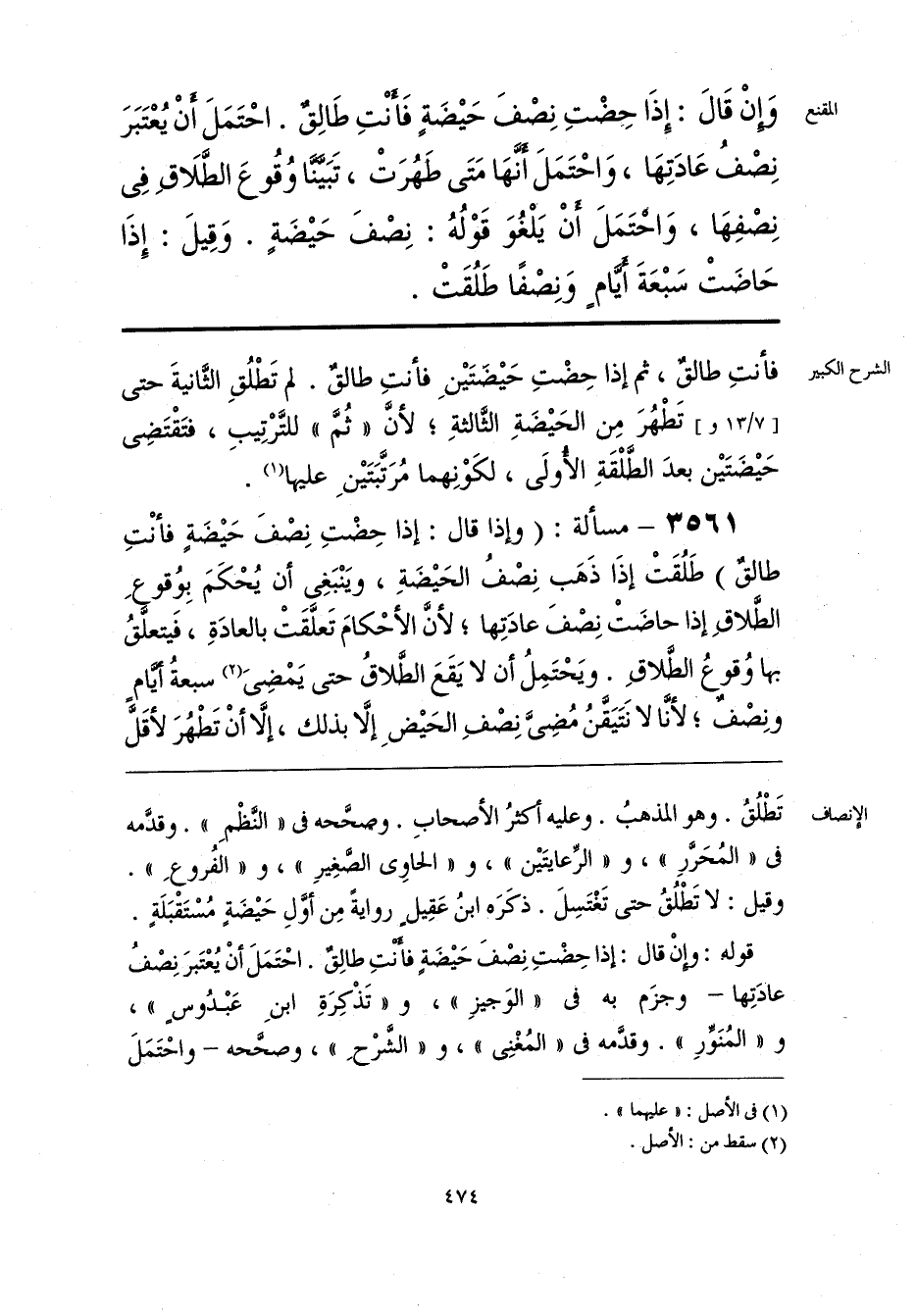قوله: وإِنْ قال: إذا حِضْتِ نِصْفَ حَيضَةٍ فأَنْتِ طالِقٌ. احْتَمَلَ أنْ يُعْتَبرَ نِصْفُ عادَتِها -وجزَم به في «الوَجيزِ»، و «تَذْكِرَةِ ابنِ عَبْدُوسٍ»، و «المُنَوِّرِ». وقدَّمه في «المُغْنِي»، و «الشَّرْحِ»، وصحَّحه- واحْتَمَلَ