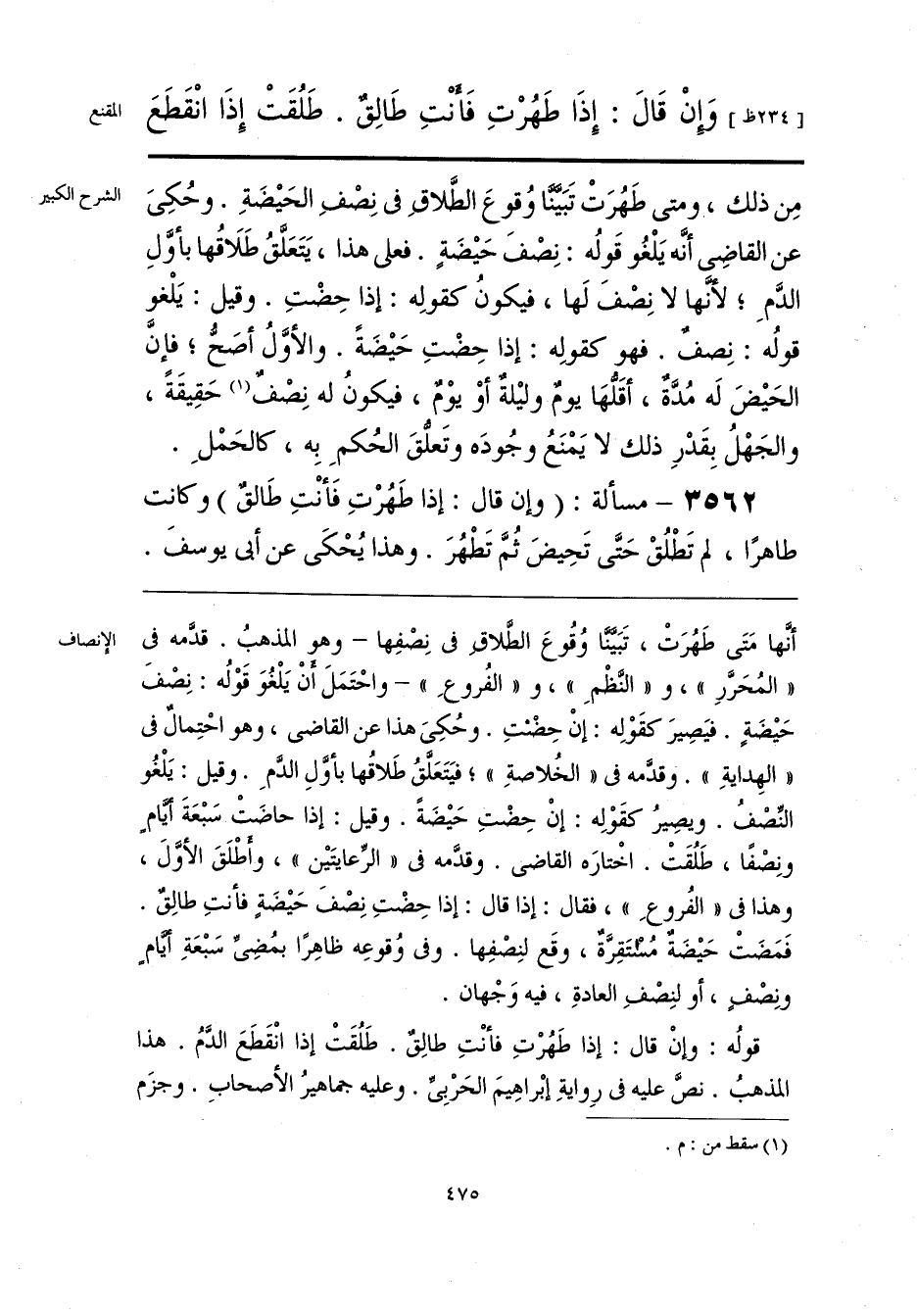 أنَّها مَتَى طَهُرَتْ، تَبَيَّنَّا وُقُوعَ الطَّلاقِ في نِصْفِها -وهو المذهبُ. قدَّمه في «المُحَرَّرِ»، و «النَّظْمِ»، و «الفُروعِ» - واحْتَمَلَ أَنْ يَلْغُوَ قَوْلُه: نِصْفَ حَيضَةٍ. فيَصِيرَ كقَوْلِه: إنْ حِضْتِ. وحُكِيَ هذا عن القاضي، وهو احْتِمالٌ في «الهِدايةِ». وقدَّمه في «الخُلاصةِ»؛ فيَتَعَلَّقُ طَلاقُها بأوَّلِ الدَّمِ. وقيل: يَلْغُو النِّصْفُ. ويصِيرُ كقَوْلِه: إنْ حِضْتِ حَيضَةً. وقيل: إذا حاضَتْ سَبْعَةَ أيَّامٍ ونِصْفًا، طَلُقَتْ. اخْتارَه القاضي. وقدَّمه في «الرِّعايتَين»، وأَطْلَقَ الأوَّلَ، وهذا في «الفُروعِ»، فقال: إذا قال: إذا حِضْتِ نِصْفَ حَيضَةٍ فأنتِ طالِقٌ. فَمَضَتْ حَيضَةٌ مُسْتَقِرَّةٌ، وقَع لنِصْفِها. وفي وُقوعِه ظاهِرًا بمُضِيِّ سَبْعَةِ أيَّامٍ ونِصْفٍ، أو لنِصْفِ العادةِ، فيه وَجْهان.