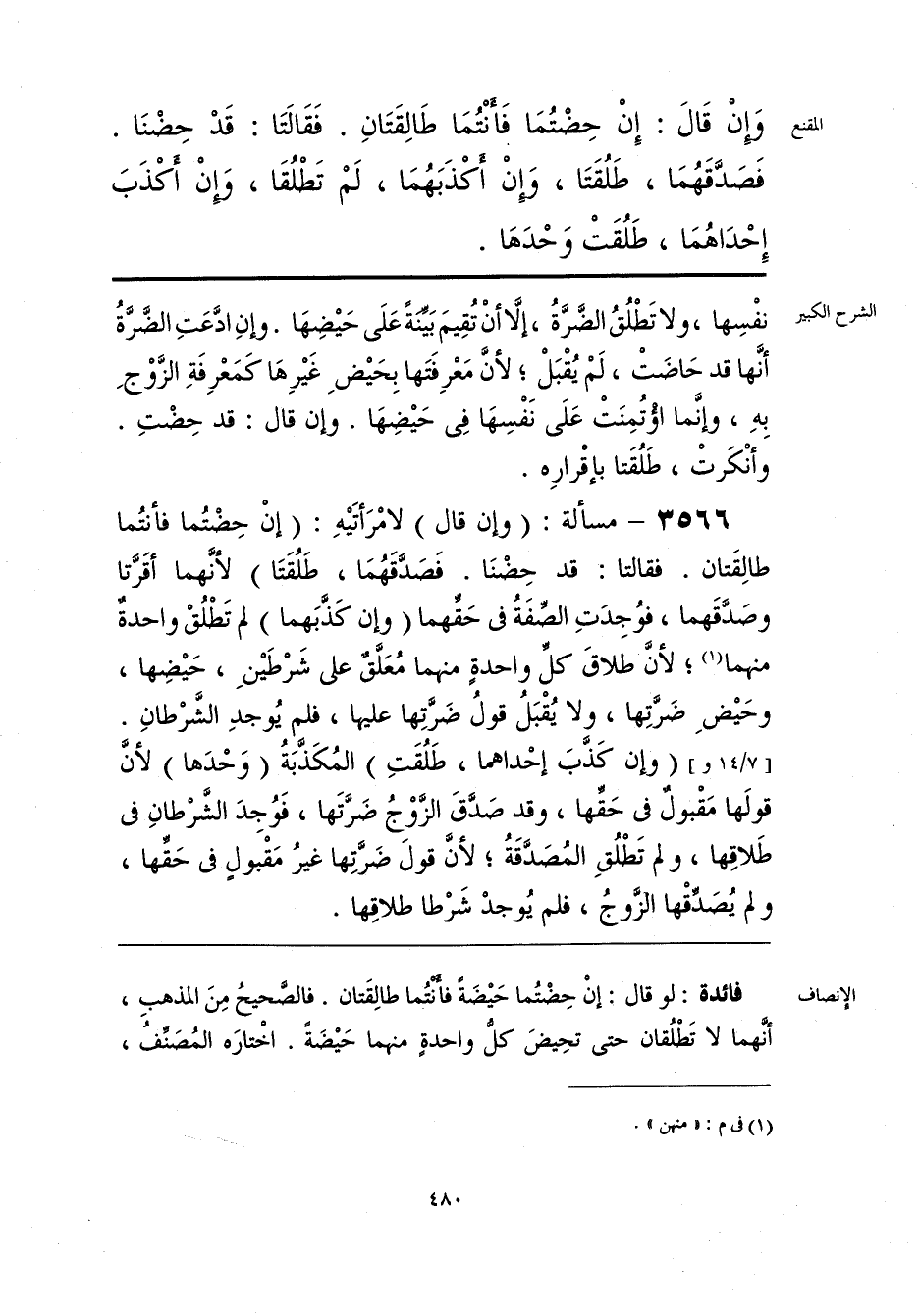 فائدة: لو قال: إنْ حِضْتُما حَيضَةً فأَنْتُما طالِقَتان. فالصَّحيحُ مِنَ المذهبِ، أنَّهما لا تَطْلُقان حتى تحِيضَ كلُّ واحدةٍ منهما حَيضَةً. اخْتارَه المُصَنِّفُ،