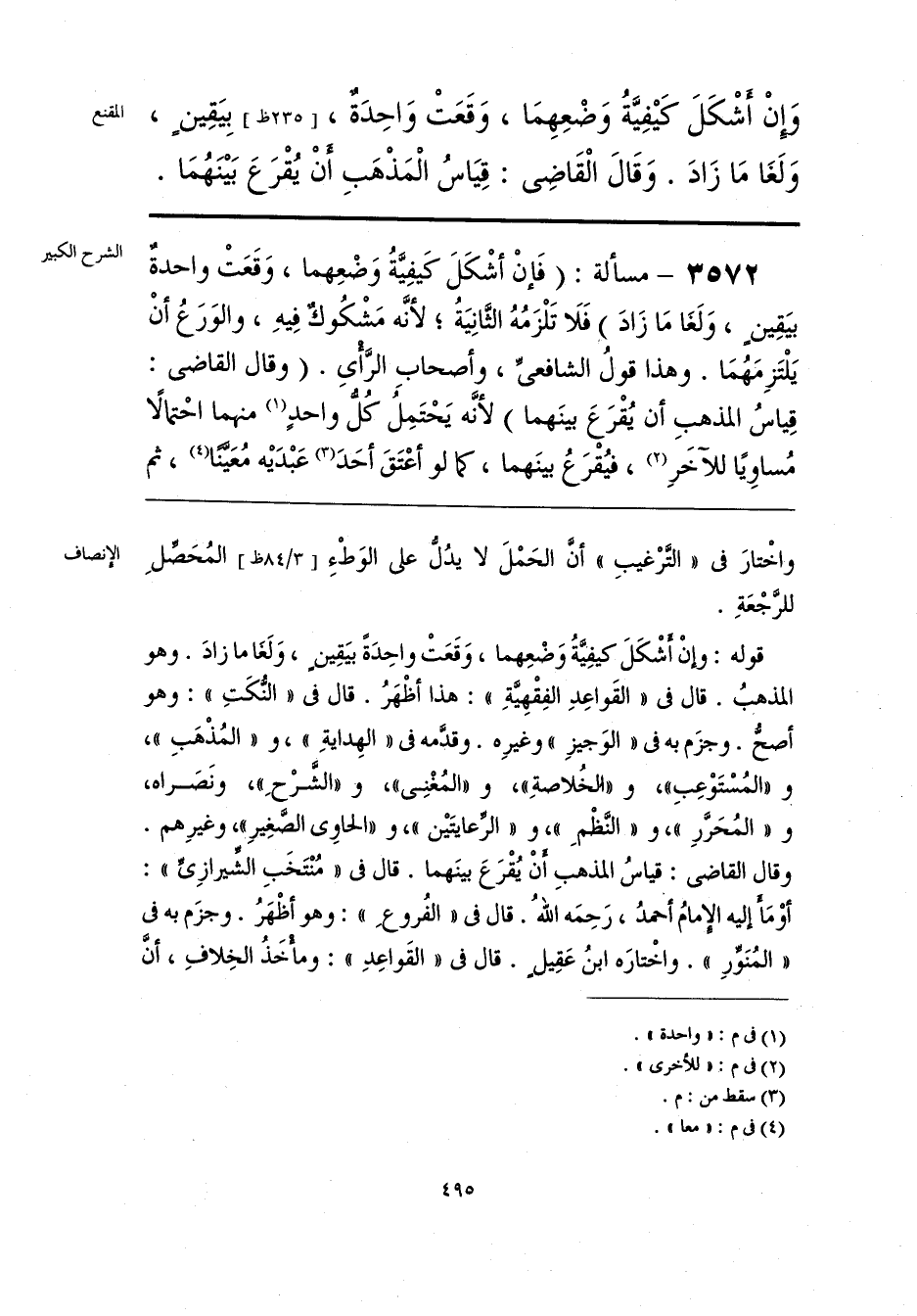 قوله: وإنْ أَشْكَلَ كيفِيَّةُ وَضْعِهما، وَقَعَتْ واحِدَةً بيَقِينٍ، وَلَغا ما زادَ. وهو المذهبُ. قال في «القَواعِدِ الفِقْهِيَّةِ»: هذا أظْهَرُ. قال في «النُّكَتِ»: وهو أصحُّ. وجزَم به في «الوَجيزِ» وغيرِه. وقدَّمه في «الهِدايةِ»، و «المُذْهَبِ»، و «المُسْتَوْعِبِ»، و «الخُلاصةِ»، و «المُغْنِي»، و «الشَّرْحِ»، ونَصَراه، و «المُحَرَّرِ»، و «النَّظْمِ»، و «الرِّعايتَين»، و «الحاوي الصَّغِيرِ»، وغيرِهم. وقال القاضي: قياسُ المذهبِ أَنْ يُقْرَعَ بينَهما. قال في «مُنْتَخَبِ الشِّيرازِيِّ»: أوْمَأَ إليه الإِمامُ أحمدُ، رَحِمَه اللهُ. قال في «الفُروعِ»: وهو أظْهَرُ. وجزَم به في «المُنَوِّرِ». واخْتارَه ابنُ عَقِيلٍ. قال في «القَواعِدِ»: ومأْخَذُ الخِلافِ، أنَّ