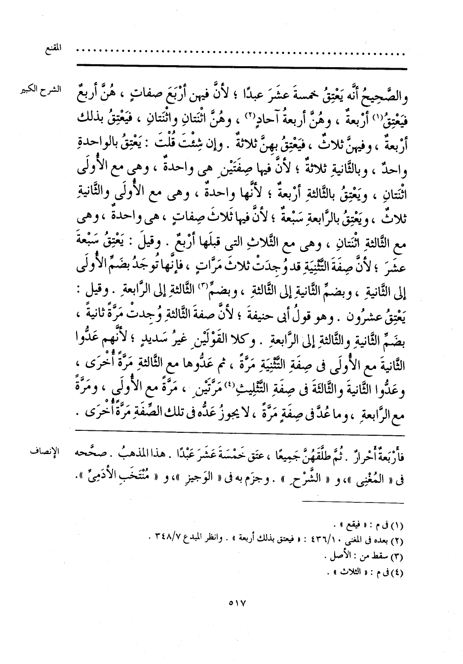 فأَربَعةٌ أَحْرارٌ. ثُمَّ طلَّقَهُنَّ جَمِيعًا، عتَق خَمْسَةَ عَشَرَ عَبْدًا. هذا المذهبُ. صحَّحه في «المُغْنِي»، و «الشَّرْحِ». وجزَم به في «الوَجيزِ»، و «مُنْتَخَبِ الأدَمِيِّ».