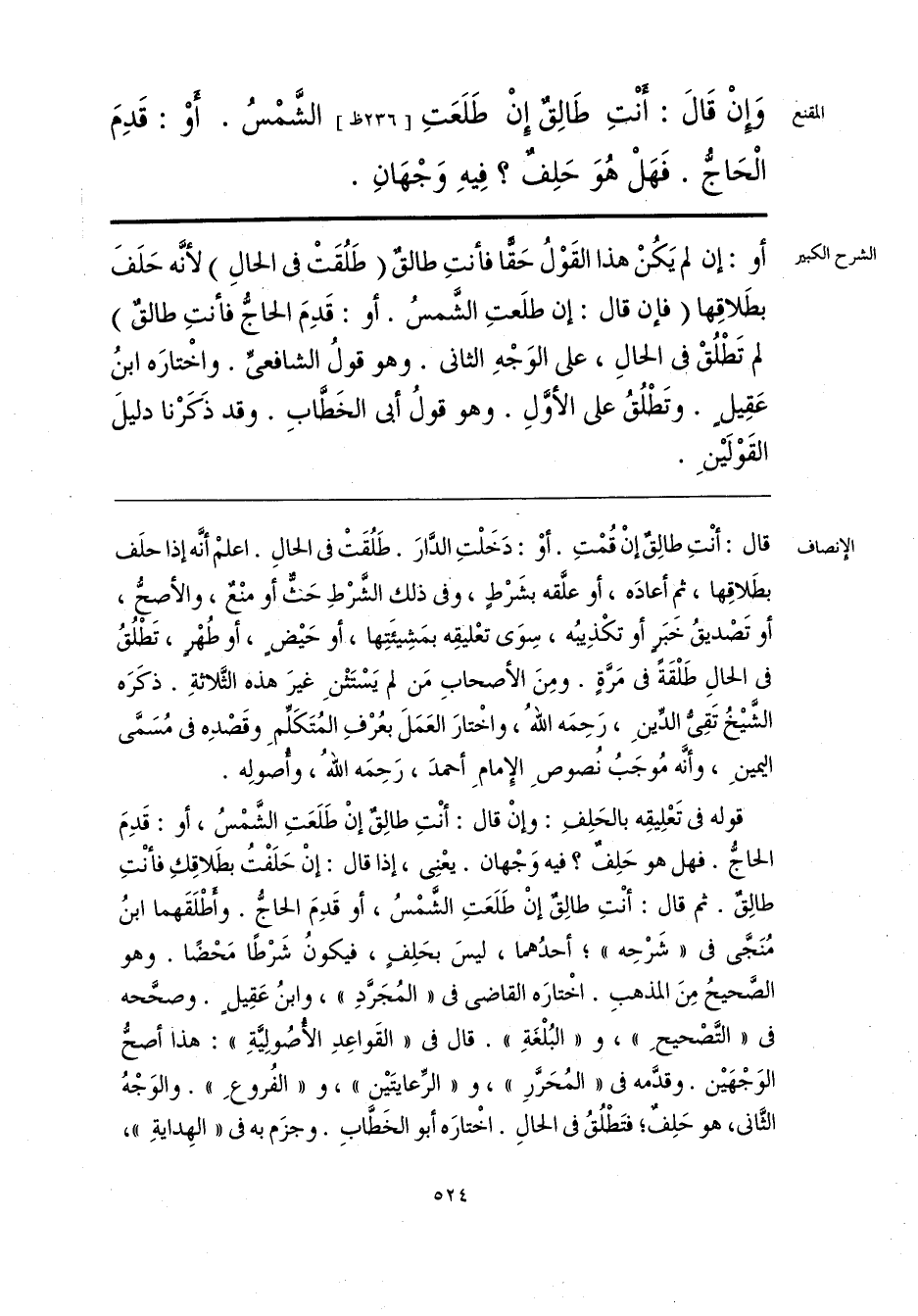 قوله في تَعْلِيقِه بالحَلِفِ: وإنْ قال: أنْتِ طالِقٌ إنْ طَلَعَتِ الشَّمْسُ، أو: قَدِمَ الحاجُّ. فهل هو حَلِفٌ؟ فيه وَجْهان. يعْنِي، إذا قال: إنْ حَلَفْتُ بطَلاقِكِ فأنْتِ طالِقٌ. ثم قال: أنْتِ طالِقٌ إنْ طَلَعَتِ الشَّمْسُ، أو قَدِمَ الحاجُّ. وأطْلَقَهما ابنُ مُنَجَّى في «شَرْحِه»؛ أحدُهما، ليسَ بحَلِفٍ، فيكونُ شَرْطًا مَحْضًا. وهو الصَّحيحُ مِنَ المذهبِ. اخْتارَه القاضي في «المُجَرَّدِ»، وابنُ عَقِيلٍ. وصحَّحه في «التَّصْحيحِ»، و «البُلْغَةِ». قال في «القَواعِدِ الأصُولِيَّةِ»: هذا أصحُّ الوَجْهَين. وقدَّمه في «المُحَرَّرِ»، و «الرِّعايتَين»، و «الفُروعِ». والوَجْهُ الثَّاني، هو حَلِفٌ؛ فتَطْلُقُ في الحالِ. اخْتارَه أبو الخَطَّابِ. وجزَم به في «الهِدايةِ»،
