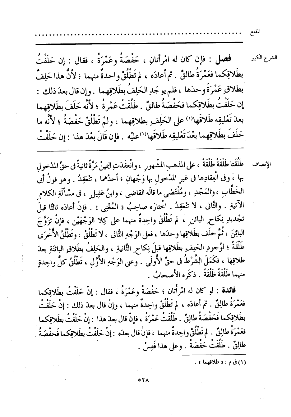 فائدة: لو كان له امْرأتان؛ حَفْصَةُ وعَمْرَةُ، فقال: إنْ حَلَفْتُ بطَلاقِكما فعَمْرَةُ طالِقٌ. ثم أعادَه، لم تَطْلُقْ واحِدة منهما، وإنْ قال بعدَ ذلك: إنْ حَلَفْتُ بطَلاقِكما فَحَفْصَةُ طالِقٌ. طَلُقَتْ عَمْرَةُ، فإنْ قال بعدَ هذا: إنْ حَلَفْتُ بطَلاقِكما فعَمْرَةُ طالِقٌ. لم تَطْلُقْ واحِدة منهما، فإن قال بعدَه: إنْ حَلَفْتُ بطَلاقِكما فَحفْصَةُ طالِقٌ. طَلُقَتْ حَفْصَةُ. وعلى هذا فَقِسْ.