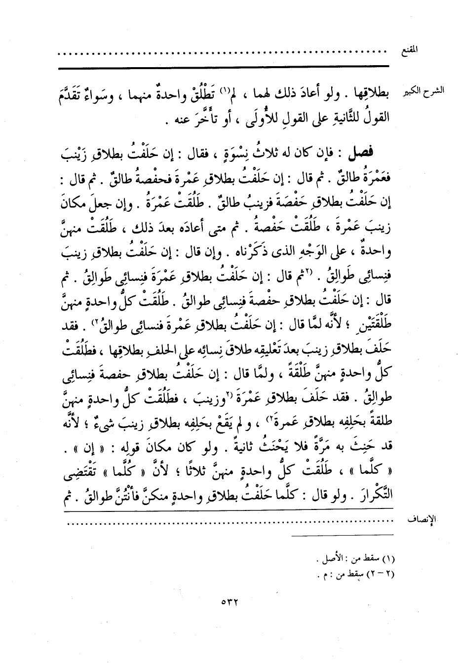 فصل: فإن كان له ثلاثُ نِسْوَةٍ، فقال: إن حَلَفْتُ بطلاقِ زَينبَ فعَمْرَةُ طالقٌ. ثم قال: إن حَلَفْتُ بطلاقِ عَمْرةَ فحفْصةُ طالقٌ. ثم قال: إن حَلَفْتُ بطلاقِ حَفْصَةَ فزينبُ طالقٌ. طَلُقَتْ عَمْرَةُ. وإن جعلَ مكانَ زينبَ عَمْرةَ، طَلُقَتْ حَفْصةُ. ثم متى أعادَه بعدَ ذلك، طَلُقَتْ منهنَّ واحدةٌ، على الوَجْهِ الذي ذَكَرْناه. وإن قال: إن حَلَفْتُ بطلاقِ زينبَ فنِسائِي طَوالِقُ. [ثم قال: إن حَلَفْتُ بطلاقِ عَمْرَةَ فنِسائِي طَوالِقُ. ثم قال: إن حَلَفْتُ بطلاقِ حفْصةَ فنِسائِي طوالقُ. طَلُقَتْ كلُّ واحدةٍ منهنَّ طَلْقَتَينِ؛ لأنَّه لمَّا قال: إن حَلَفْتُ بطلاقِ عَمْرةَ فنسائِي طوالقُ] (¬2). فقد حَلَفَ بطلاقِ زينبَ بعدَ تَعْليقِه طلاقَ نِسائِه على الحلفِ بطلاقِها، فطَلُقَتْ كلُّ واحدةٍ منهنَّ طَلْقَةً، ولمَّا قال: إن حَلَفْتُ بطلاقِ حفصةَ فنِسائِي طوالِقُ. فقد حَلَفَ بطلاقِ عَمْرَةَ [وزينبَ، فطَلُقَتْ كلُّ واحدةٍ منهنَّ طلقةً بحَلِفِه بطلاقِ عَمرةَ] (2)، ولم يَقَعْ بحَلِفِه بطلاقِ زينبَ شيءٌ؛ لأنَّه قد حَنِثَ به مَرَّةً فلا يَحْنَثُ ثانيةً. ولو كان مكانَ قولِه: «إن». «كلَّما»، طَلُقَتْ كلُّ واحدةٍ منهنَّ ثلاثًا؛ لأنَّ «كُلَّما» تَقْتَضِي التَّكْرارَ. ولو قال: كلَّما حَلَفْتُ بطلاقِ واحدةٍ منكنَّ فأنْتُنَّ طوالقُ. ثم