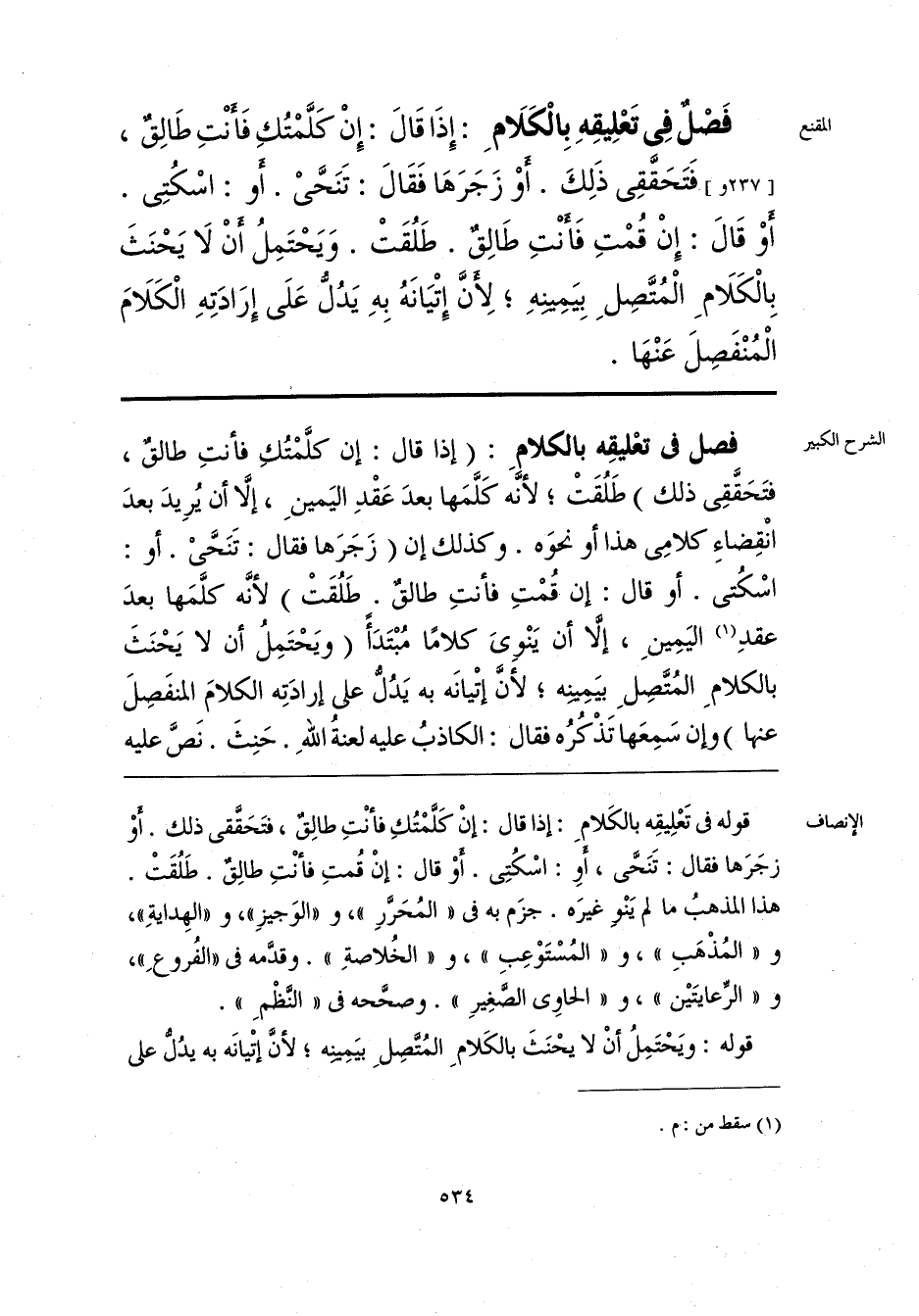 فَصْلٌ فِي تَعْلِيقِهِ بِالْكَلَامِ: إِذَا قَال: إِنْ كَلَّمْتُكِ فَأنْتِ طَالِقٌ، فَتَحَقَّقِي ذَلِكَ. أوْ زَجَرَهَا فَقَال: تَنَحَّيْ. أو: اسْكُتِي. أوْ قَال: إِنْ قُمْتِ فَأنْتِ طَالِقٌ. طَلُقَتْ. وَيَحْتَمِلُ أنْ لَا يَحْنَثَ بِالْكَلَامِ الْمُتَّصِلِ بِيَميِنِهِ، لِأنَّ إِتْيَانَهُ بِهِ يَدُلُّ عَلَى إِرَادَتِهِ الْكَلَامَ الْمُنْفَصِلَ عَنْهَا.