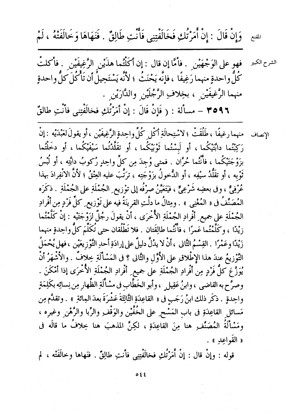 منهما رغيفًا، طَلُقَتْ؛ لاسْتِحالةِ أكْلِ كُلِّ واحِدةٍ الرَّغِيفَين، أو يقولَ لعَبْدَيه: إنْ رَكِبْتُما دابَّتَيكُما، أو لَبِسْتُما ثَوْبَيكُما، أو تقَلَّدْتُما سَيفَيكُما، أو دخَلْتُما بزَوْجَتَيكُما، فأَنْتُما حُرَّان. فمتى وُجِدَ مِن كلِّ واحِدٍ رُكوبُ دابَّتِه، أو لُبْسُ ثَوْبِه، أو تقَلُّدُ سيفِه، أو الدُّخولُ بزَوْجَتِه، ترَتَّبَ عليه العِتْقُ؛ لأنَّ الانْفِرادَ بهذا عُرْفِيٌّ، وفي بعضِه شَرْعِيٌّ، فيَتَعَيَّنُ صرْفُه إلى توْزيعِ الجُمْلَةِ على الجُمْلَةِ. ذكَرَه المُصَنِّفُ في «المُغْنِي». ومِثالُ ما دلَّتِ القرِينَةُ فيه على تَوْزيعِ كلِّ فَرْدٍ مِن أفْرادِ الجُمْلَةِ على جميعِ أفْرادِ الجُمْلَةِ الأُخْرَى، أنْ يقولَ رجُلٌ لزَوْجَتَيه: إنْ كَلَّمْتُما زيدًا، وكَلَّمْتُما عَمرًا، فأنْتُما طالِقَتان. فلا تَطْلُقان حتى تُكَلِّمَ كلُّ واحِدةٍ منهما زَيدًا وعَمْرًا. القِسْمُ الثَّاني، أنْ لا يدُلَّ دليلٌ على إرادَةِ أحدِ التَّوْزِيعَين، فهل يُحْمَلُ التَّوْزيعُ عندَ هذا الإطْلاقِ على الأوَّلِ والثَّاني؟ في المَسْألَةِ خِلافٌ. والأشْهَرُ أنْ يُوَزَّعَ كل فَرْدٍ مِن أفْرادِ الجُمْلَةِ على جميعِ أفْرادِ الجُمْلَةِ الأُخْرَى إذا أمْكَنَ. وصرَّح به القاضي، وابنُ عَقِيلٍ، وأبو الخَطَّابِ في مسْأَلَةِ الظِّهارِ مِن نِسائِه بكَلِمَةٍ واحِدةٍ. ذكَر ذلك ابنُ رَجَب في «القاعِدَةِ الثَّالِثَةَ عَشْرَةَ بعدَ المِائةِ». وتقدَّم مِن مَسائلِ القاعِدَةِ في بابِ المَسْحِ على الخُفَّين والوَقْفِ والرِّبا والرَّهْنِ وغيرِه، ومَسْألَةُ المُصَنِّفِ هنا مِنَ القاعِدَةِ، لكِنَّ المذهبَ هنا خِلافُ ما قاله في «القَواعِدِ».