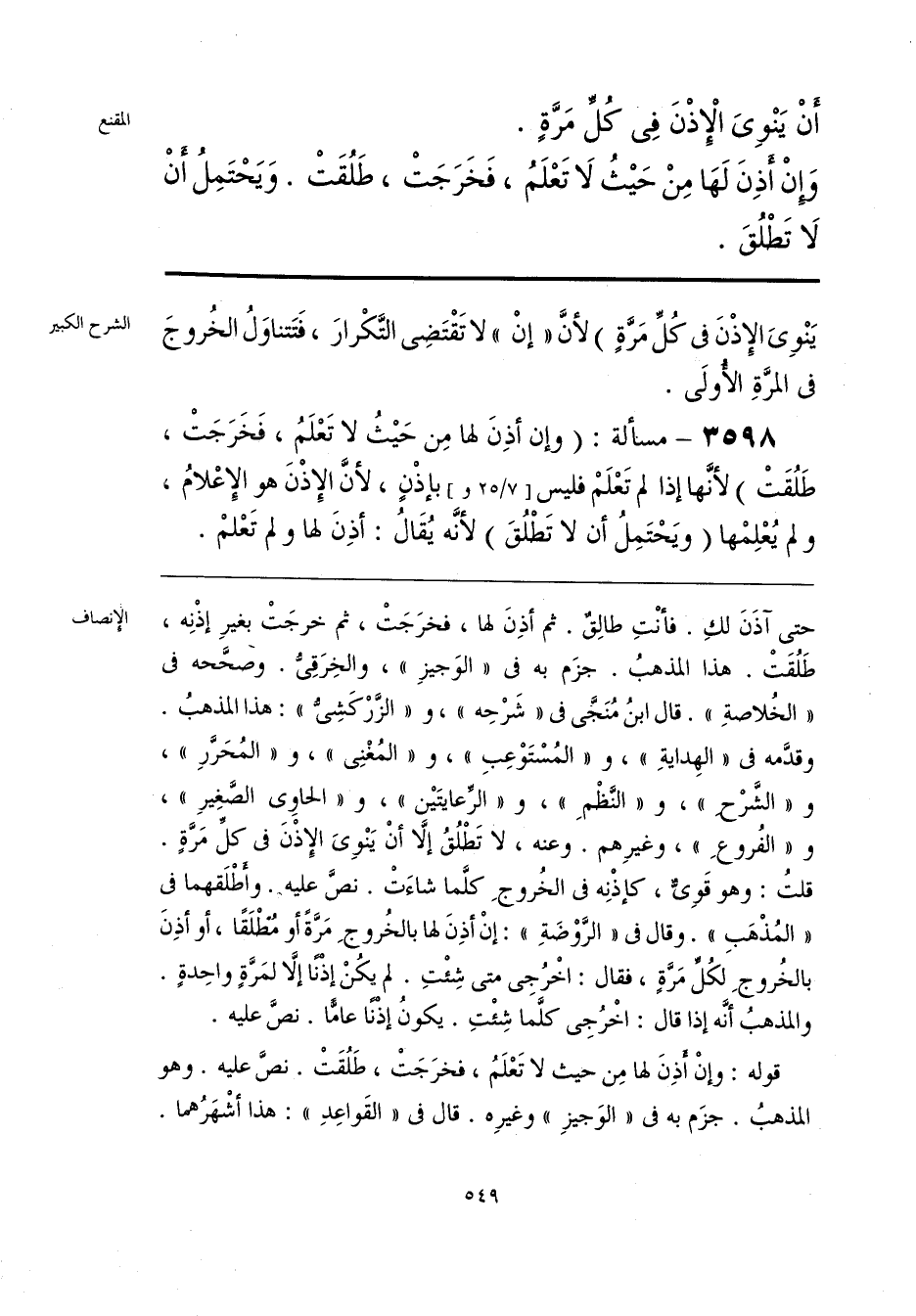 حتى آذَنَ لكِ. فأنْتِ طالِقٌ. ثم أذِنَ لها، فخرَجَتْ، ثم خرجَتْ بغيرِ إذْنِه، طَلُقَتْ. هذا المذهبُ. جزَم به في «الوَجيزِ»، والخِرَقِيُّ. وصحَّحه في «الخُلاصةِ». قال ابنُ مُنَجَّى في «شَرْحِه»، و «الزَّرْكَشِيُّ»: هذا المذهبُ. وقدَّمه في «الهِدايةِ»، و «المُسْتَوْعِبِ»، و «المُغْنِي»، و «المُحَرَّرِ»، و «الشَّرْحِ»، و «النَّظْمِ»، و «الرِّعايتَين»، و «الحاوي الصَّغِيرِ»، و «الفُروعِ»، وغيرِهم. وعنه، لا تَطْلُقُ إلَّا أنْ يَنْويَ الإِذْنَ في كلِّ مَرَّةٍ. قلتُ: وهو قَويٌّ، كإذْنِه في الخُروجِ كلَّما شاءَتْ. نصَّ عليه. وأطْلَقهما في «المُذْهَبِ». وقال في «الرَّوْضَةِ»: إنْ أذِنَ لها بالخُروجِ مَرَّةً أو مُطْلَقًا، أو أذِنَ بالخُروجِ لكُلِّ مَرَّةٍ، فقال: اخْرُجِي متى شِئْتِ. لم يكُنْ إذنا إلَّا لمَرَّةٍ واحِدةٍ. والمذهبُ أنَّه إذا قال: اخْرُجِي كلَّما شِئْتِ. يكونُ إذْنًا عامًّا. نصَّ عليه.