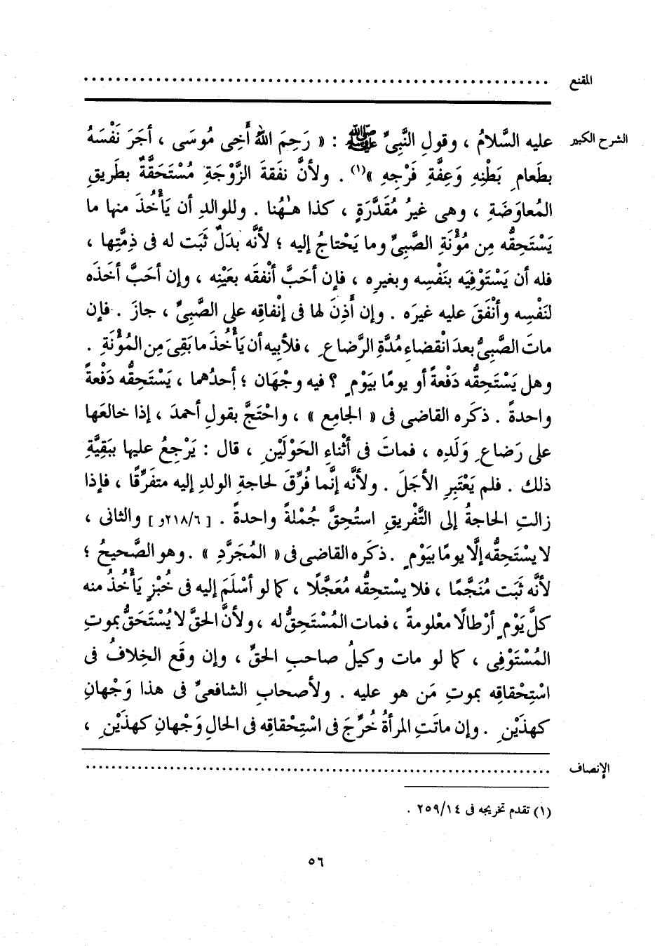 عليه السَّلامُ، وقولِ النَّبِىِّ -صلى اللَّه عليه وسلم-: «رَحِمَ اللَّهُ أَخِى مُوسَى، أجَرَ نَفْسَه بطَعامِ بَطْنِهِ وَعِفَّةِ فَرْجهِ» (¬1). ولأَنَّ نفَقةَ الزَّوْجَة مُسْتَحَقَّةٌ بطَريقِ المُعاوَضةِ، وهى غير مُقَدَّرَةٍ، كذا ههُنا. وللوالدِ أن يَأْخُذَ منها ما يَسْتَحِقُّه مِن مُؤْنَةِ الصَّبِىِّ وما يَحْتاجُ إليه؛ لأنَّه بدَل ثَبَت له في ذِمَّتِها، فله أنَّ يَسْتَوْفِيَه بنَفْسِه وبغيرِه، فإن أحَبَّ أنْفقَه بعَيْنِه، وإن أحَبَّ أخَذَه لنَفْسِه وأنْفَقَ عليه غيرَه. وإن أذِنَ لها في إنْفاقِه على الصَّبِىِّ، جازَ. فإن ماتَ الصَّبِىُّ بعدَ انْقضاءِ مُدَّةِ الرَّضاعِ، فلأبِيه أنَّ يَأْخُذَ ما بَقِىَ مِن المُؤْنَةِ. وهل يَسْتَحِقُّه دَفْعةً أو يومًا بيَوْمٍ؟ فيه وجْهَان؛ إحدُهما، يَسْتَحِقُّه دَفْعةً واحدةً. ذكَره القاضى في «الجَامِع»، واحْتَجَّ بقولِ أحمدَ، إذا خالعَها على رَضاعِ وَلَدِه، فماتَ في أثْناء الحَوْلَيْنِ، قال: يَرْجِعُ عليها ببَقِيَّةِ ذلك. فلم يَعْتَبِرِ الأجَلَ. ولأنَّه إنَّمَا فُرِّقَ لحاجةِ الولدِ إليه متفَرِّقًا، فإذا زالتِ الحاجةُ إلى التَّفْريقِ استُحِقَّ جُمْلةً واحدةً. والثانى، لا يسْتَحِقُّه إلَّا يومًا بيَوْمٍ. ذكره القاضى في «المُجَرَّدِ». وهو الصَّحيحُ؛ لأنَّه ثَبَت مُنَجَّمًا، فلا يسْتحِقه مُعَجَّلًا، كما لو أسْلَمَ إليه في خبْز يَأْخُذُ منه كلَّ يَوْم أرْطالًا معْلومةً، فمات المُسْتَحِقُّ له، ولأَنَّ الحقَّ لا يُسْتَحَقُّ بموتِ المُسْتَوْفِى، كما لو مات وكيلُ صاحبِ الحقِّ، وإن وقَع الخِلافُ في اسْتِحْقاقِه بموتِ مَن هو عليه. ولأصحابِ الشافعىِّ في هذا وَجْهانِ كهذَيْنِ. وإن ماتَتِ المرأةُ خُرِّجَ في اسْتِحْقاقِه في الحالِ وَجْهانِ كهذَيْنِ،