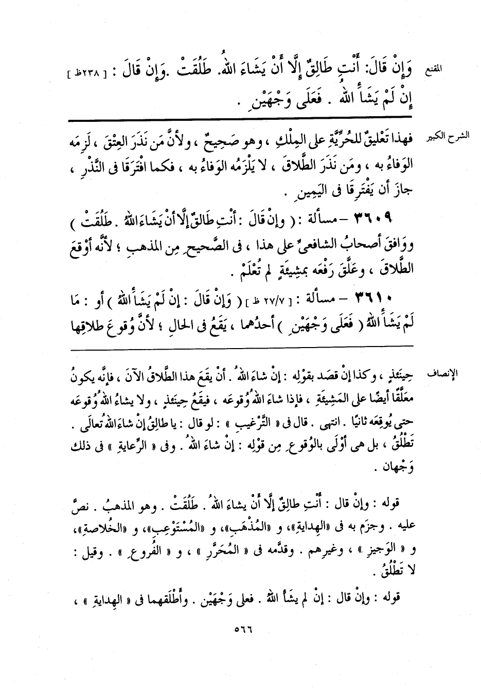 حِينَئذٍ، وكذا إنْ قصَد بقوْلِه: إنْ شاءَ اللهُ. أنْ يقَعَ هذا الطّلاقُ الآنَ، فإنه يكونُ معَلقًا أيضًا على المَشِيئَةِ، فإذا شاءَ اللهُ وُقوعَه، فيقَعُ حِينَئذٍ، ولا يشاءُ اللهُ وُقوعَه حتى يُوقِعَه ثانيًا. انتهى. قال في «الترْغيبِ»: لو قال: يا طالِقُ إنْ شاءَ اللهُ تعالى. تَطْلُقُ، بل هي أوْلَى بالوُقوعِ مِن قوْلِه: إنْ شاءَ اللهُ. وفي «الرِّعايةِ» في ذلك وَجْهان.