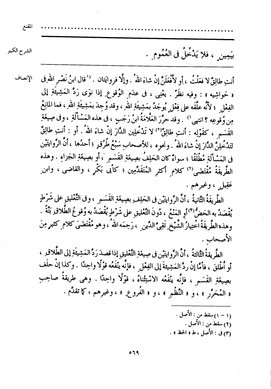 أنتِ طالِقٌ لا فعَلْتُ، أو لأفْعَلَنَّ إنْ شاءَ اللهُ. وإلَّا فرِوايَتان. [قال ابنُ نَصْرِ اللهِ في «حَواشِيه»: وفيه نظَرٌ. يعْنِي، في عدَم الوُقوعِ إذا نوَى رَدَّ المَشِيئَةِ إلى الفِعْلِ؛ لأنه علَّقَه على فِعْل يُوجَدُ بمَشِيئَةِ الله، وقد وُجِدَ بمَشِيئَه اللهِ، فما المانِعُ مِن وُقوعِه؟ انتهى] (¬1). وقد حرَّرَ العَلَّامَةُ ابنُ رَجَبٍ، في هذه المَسْألةِ، وفي صِيغَةِ القَسَمِ، كقَوْلِه: أنتِ طالِقٌ (¬2) لا تَدْخُلِين الدَّارَ إنْ شاءَ اللهُ. أو: أنتِ طالِق لتَدْخُلِنَّ الدَّارَ إنْ شاءَ اللهُ. ونحوه، للأصحابِ سَبْعُ طُرُقٍ؛ أحدُها، أنَّ الرِّوايتَين في المَسْألةِ مُطْلَقًا؛ سواء كان الحَلِفُ بصِيغَةِ القَسَمِ، أو بصِيغَةِ الجَزاءِ. وهذه الطَّريقَةُ مُقْتَضى (2) كلامِ أكثرِ المُتَقَدِّمِين؛ كأبي بَكْر، والقاضي، وابنِ عَقِيل، وغيرِهم.