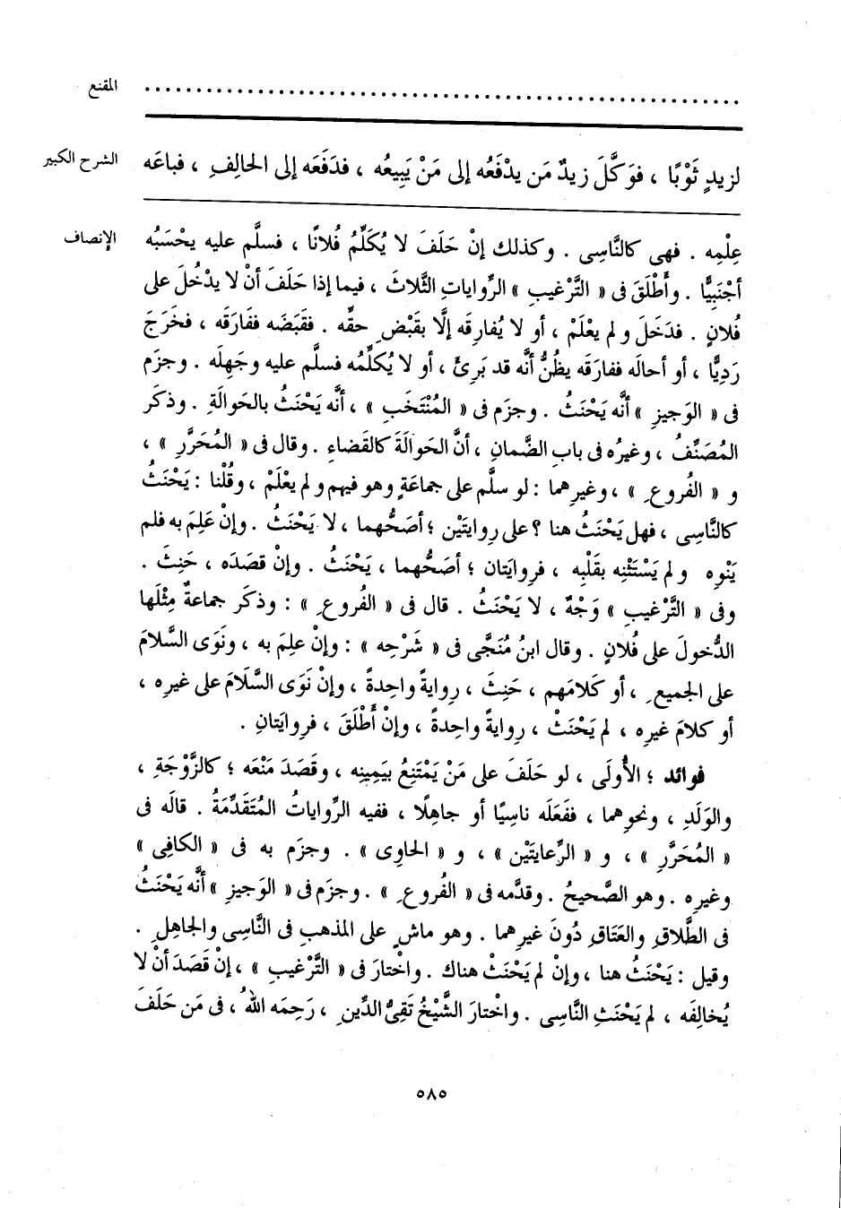 عِلْمِه. فهي كالناسِي. وكذلك إنْ حَلَفَ لا يُكَلِّمُ فُلانًا، فسلم عليه يحْسَبُه أجْنَبِيًّا. وأطْلَقَ في «الترْغيبِ» الرِّواياتِ الثلاثَ، فيما إذا حَلَفَ أنْ لا يدْخُلَ على فُلانٍ. فدَخَلَ ولم يعْلَمْ، أو لا يُفارِقَه إلَّا بقَبْضِ حقه. فقَبَضَه ففَارَقَه، فخرَجَ رَدِيًّا، أو أحاله ففارَقَه يظُنُّ أنَّه قد بَرئ، أو لا يُكلِّمُه فسلم عليه وجَهِلَه. وجزَم في «الوَجيز» أنه يَحْنَثُ. وجزَم في «المُنْتَخَب»، أنَّه يَحْنَثُ بالحَوالةِ. وذكَر المُصَنفُ، وغيرُه في بابِ الضَّمانِ، أنَّ الحَوالةَ كالقَضاءِ. وقال في «المُحَررِ»، و «الفُروعِ»، وغيرِهما: لو سلَّم على حماعَةٍ وهو فيهم ولم يعْلَمْ، وقُلْنا: يَحْنَثُ كالنَّاسِي، فهل يَحْنَثُ هنا؟ على رِوايتَين؛ أصَحهما، لا. يَحْنَثُ. وإنْ عَلِمَ به فلم يَنْوه ولم يَسْتَثْنِه بقَلْبِه، فرِوايَتان؛ أصَحهما، يَحْنَثُ. وإنْ قصَدَه، حَنِثَ. وفي «التَّرْغيبِ» وَجْهٌ، لا يَحنَثُ. قال في «الفُروعِ»: وذكَر جماعة مِثلَها الدخولَ كل فُلانٍ. وقال ابنُ منجى في «شَرْحِ»: وإنْ علِمَ به، ونَوَى السَّلامَ على الجميعِ، أو كَلامَهم، حَنِثَ، رِواية واحِدةً، وإن نَوَى السَّلَامَ على غيرِه، أو كلامَ غيرِه، لم يَحْنَثْ، رِوايةً واحِدةً، وإنْ أطْلَقَ، فرِوايَتانِ.