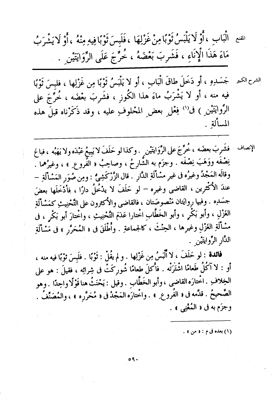 الْبَابِ، أو لَا يَلْبَسُ ثَوْبًا مِنْ غَزْلِهَا، فَلَبِسَ ثَوْبًا فِيهِ مِنْهُ، أوْ لَا يَضْرَبُ مَاءَ هَذَا الإنَاءِ، فَضَرِبَ بَعْضَهُ، خُرِّجَ عَلَى الرِّوَايَتَينِ.
