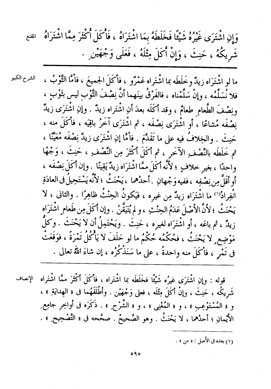 قوله: وإنِ اشْتَرَى غيرُه شَيئًا فخَلَطَه بما اشْتَراه، فأكَلَ أكثر ممَّا اشْتَراه شَرِيكُه، حَنِثَ، وإنْ أكَلَ مِثْلَه، فعلى وَجْهَين. وأطْلَقَهُما في «الهِدايَةِ»، و «المُسْتَوْعِبِ»، و «المُغْنِي»، و «الشَّرْحِ». ذَكَرَه في أواخِرِ جامِعِ الأيمانِ؛ أحدُهما، لا يَحْنَثُ. وهو الصَّحيحُ. صحَّحه في «التصْحِيحِ».