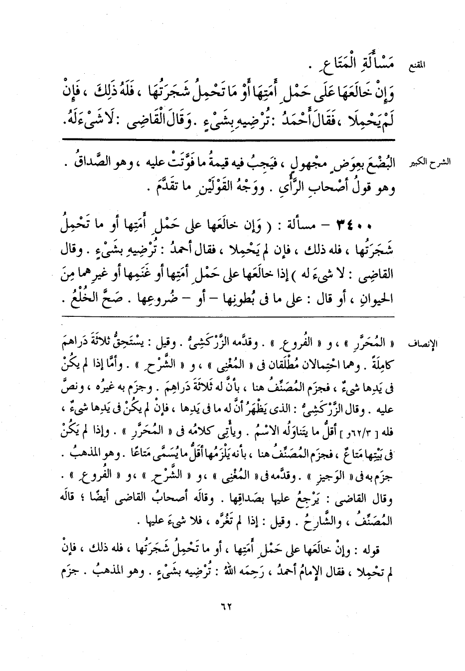 «المُحَرَّرِ»، و «الفُروعِ». وقدَّمه الزَّرْكَشِىُّ. وقيل: يسْتَحِقُّ ثلَاثَةَ دَراهمَ كامِلَةً. وهما احْتِمالان مُطْلَقان فى «المُغْنِى»، و «الشَّرْحِ». وأما إذا لم يكُنْ فى يَدِها شئٌ، فجزَم المُصَنِّفُ هنا، بأنَّ له ثَلَاثَةَ دَراهِمَ. وجزَم به غيرُه، ونصَّ عليه. وقال الزَّرْكَشِىُّ: الذى يَظْهَرُ أنَّ له ما فى يَدِها، فإنْ لم يكُنْ فى يَدِها شئٌ، فله أقلُّ ما يتَناوَلُه الاسْمُ. ويأْتِى كلامُه فى «المُحَرَّرِ». وإذا لم يَكُنْ فى بَيْتِها مَتاعٌ، فجزَم المُصَنِّفُ هنا، بأنه يَلْزَمُها أقَلُّ ما يُسَمَّى مَتاعًا. وهو المذهبُ. جزَم به فى «الوَجيزِ». وقدَّمه فى «المُغْنِى»، و «الشَّرْحِ»، و «الفُروعِ». وقال القاضى: يَرْجِعُ عليها بصَداقِها. وقالَه أصحابُ القاضى أيضًا؛ قالَه المُصَنِّفُ، والشَّارِحُ. وقيل: إذا لم تَغُرَّه، فلا شئَ عليها.