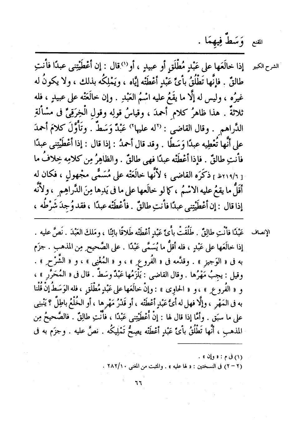عَبْدًا فأنْتِ طالِقٌ. طَلُقَتْ بأىِّ عَبْدٍ أعْطَتْه طَلاقًا بائِنًا، ومَلكَ العَبْدَ. نَصَّ عليه. إذا خالَعَها على عَبْدٍ، فله أقل ما يُسَمَّى عَبْدًا. على الصَّحيحِ مِن المذهبِ. جزَم به فى «الوَجيزِ». وقدَّمه فى «الفُروعِ»، و «المُغْنى»، و «الشَّرْحِ». وقيل: يجِبُ مَهْرُها، وقال القاضى: يَلْزَمُها عَبْدٌ وسَط. قال فى «المُحَرَّرِ»، و «الفُروعِ»، و «الحاوِى»: وإنْ خالَعَها على عَبْدٍ مُطْلَقٍ، فله الوَسَطُ إنْ قُلْنا به فى المَهْرِ، وإلَّا فهل له أىُّ عَبْدٍ أعْطَتْه، أو قَدْرُ مَهْرِها، أو الخُلْعُ باطِلٌ؟ يَنْبنِى على ما سبَق. وأمَّا إذا قال لها: إنْ أَعْطَيْتِنى عَبْدًا، فأَنْتِ طالِق. فالصَّحيحُ مِن المذهبِ، أنَّها تَطْلُقُ بأىِّ عَبْدٍ أعْطَتْه يصِحُّ تَمْلِيكُه. نصَّ عليه. وجزَم به فى