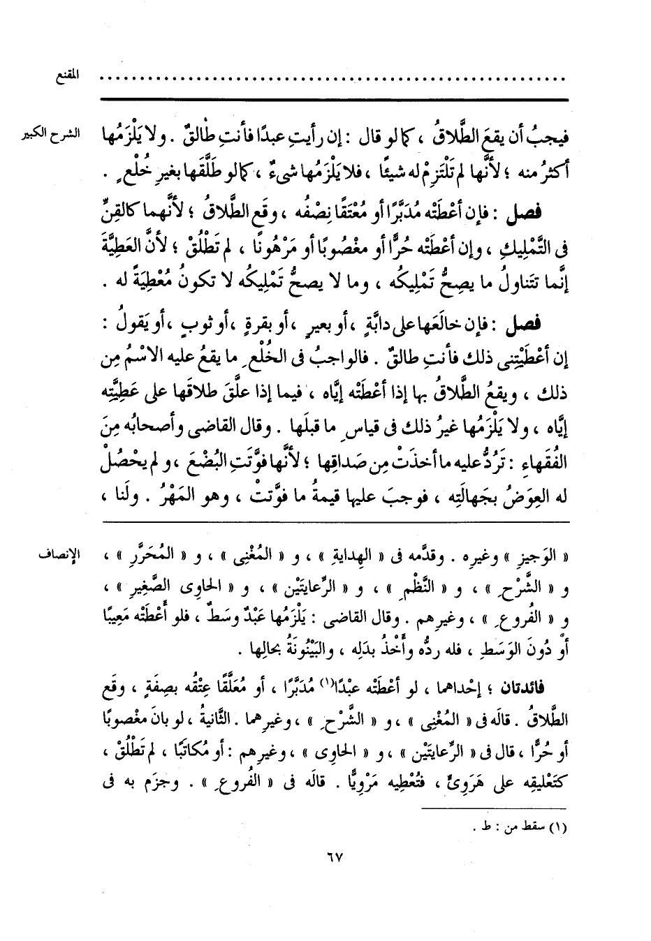 «الوَجيزِ» وغيرِه. وقدَّمه فى «الهِدايَةِ»، و «المُغْنِى»، و «المُحَرَّرِ»، و «الشَّرْحِ»، و «النَّظْمِ»، و «الرِّعايتَيْن»، و «الحاوِى الصَّغِيرِ»، و «الفُروعِ»، وغيرِهم. وقال القاضى: يَلْزَمُها عَبْدٌ وسَطٌ، فلو أعْطَتْه مَعِيبًا أو دُونَ الوَسَطِ، فله ردُّه وأخْذُ بدَلِه، والبَيْنُونَة بحالِها.