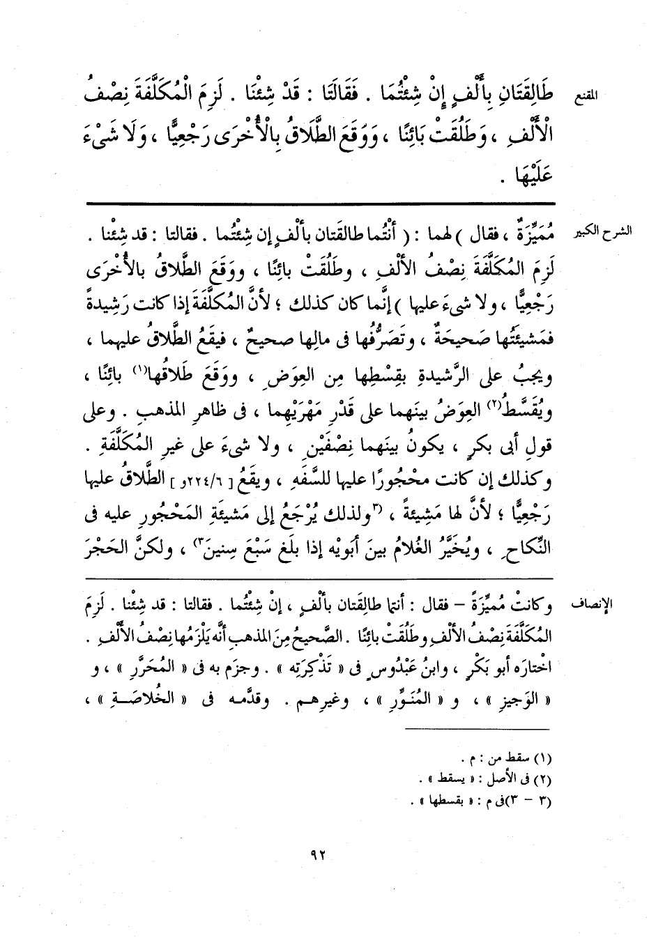 وكانتْ مُميِّزَةً- فقال: أنتما طالِقَتان بأَلْفٍ، إنْ شِئْتُما. فقالتا: قد شِئْنا. لَزِمَ المُكَلَّفَةَ نِصْمفُ الألْفِ وطَلُقَتْ بائِنًا. الصَّحيحُ مِنَ المذهبِ أنَّه يَلْزَمُها نِصْفُ الأَلْفِ. اخْتارَه أبو بَكْرٍ، وابنُ عَبْدُوسٍ فى «تَذْكِرَتِه». وجزَم به فى «المُحَرَّرِ»، و «الوَجيزِ»، و «المُنَوِّرِ»، وغيرِهم. وقدَّمه فى «الخُلاصَةِ»،