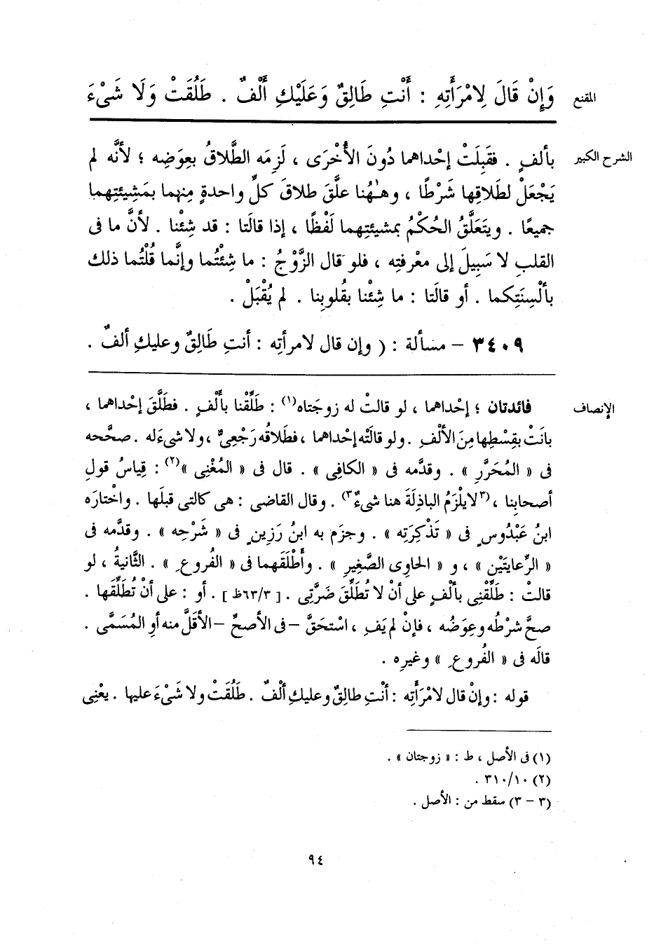 وَإِنْ قَالَ لِامْرأَتِهِ: أَنْتِ طَالِقٌ وَعَلَيْكِ أَلْفٌ. طَلُقَتْ وَلَا شَىْءَ