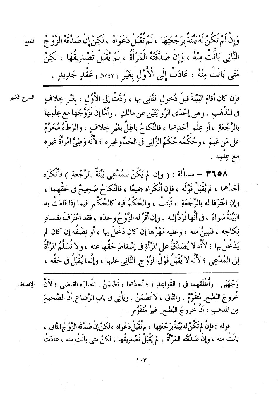 وَإنْ لَمْ تَكُنْ لَهُ بَيِّنَةٌ بِرَجْعَتِهَا, لَمْ تُقْبَلْ دَعْوَاهُ، لَكِنْ إِنْ صَدَّقَهُ الزَّوْجُ الثَّانِي بَانَتْ مِنْهُ، وَإِنْ صَدَّقَتْهُ الْمَرْأةُ، لَمْ يُقْبَلْ تَصْدِيقُهَا، لَكِنْ مَتَى بَانَتْ مِنْهُ، عَادَتْ إِلَى الأوَّلِ بِغَيرِ عَقْدٍ جَدِيدٍ.
