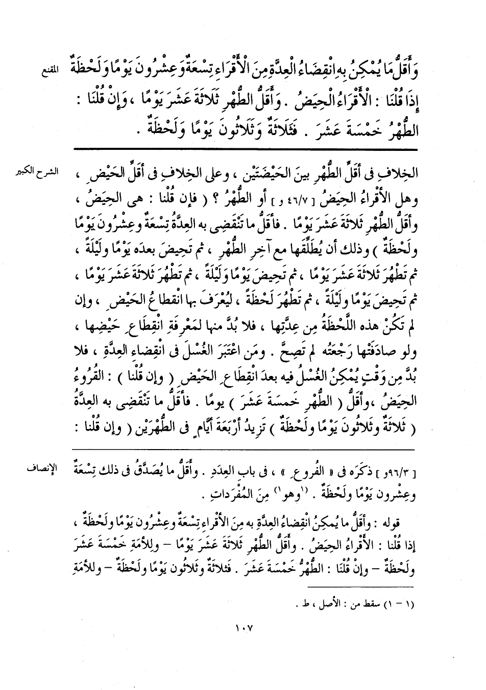 قوله: وأقَلُّ ما يُمكِنُ انْقِضاءُ العِدَّةِ به مِنَ الأقْراءِ تِسْعَة وعِشْرُون يَوْمًا ولَحْظَةٌ، إذا قُلْنا: الأقْراءُ الحِيَضُ. وأقَلُّ الطهْرِ ثَلاثَةَ عَشَرَ يَوْمًا -ولِلأمَةِ خَمْسَةَ عَشَرَ ولَحْظَةٌ- وإنْ قُلْنَا: الطُّهْرُّ خَمْسَةَ عَشَرَ. فَثلاثَةٌ وثَلاثُون يَوْمًا ولَحْظَةٌ -وللأمَةِ