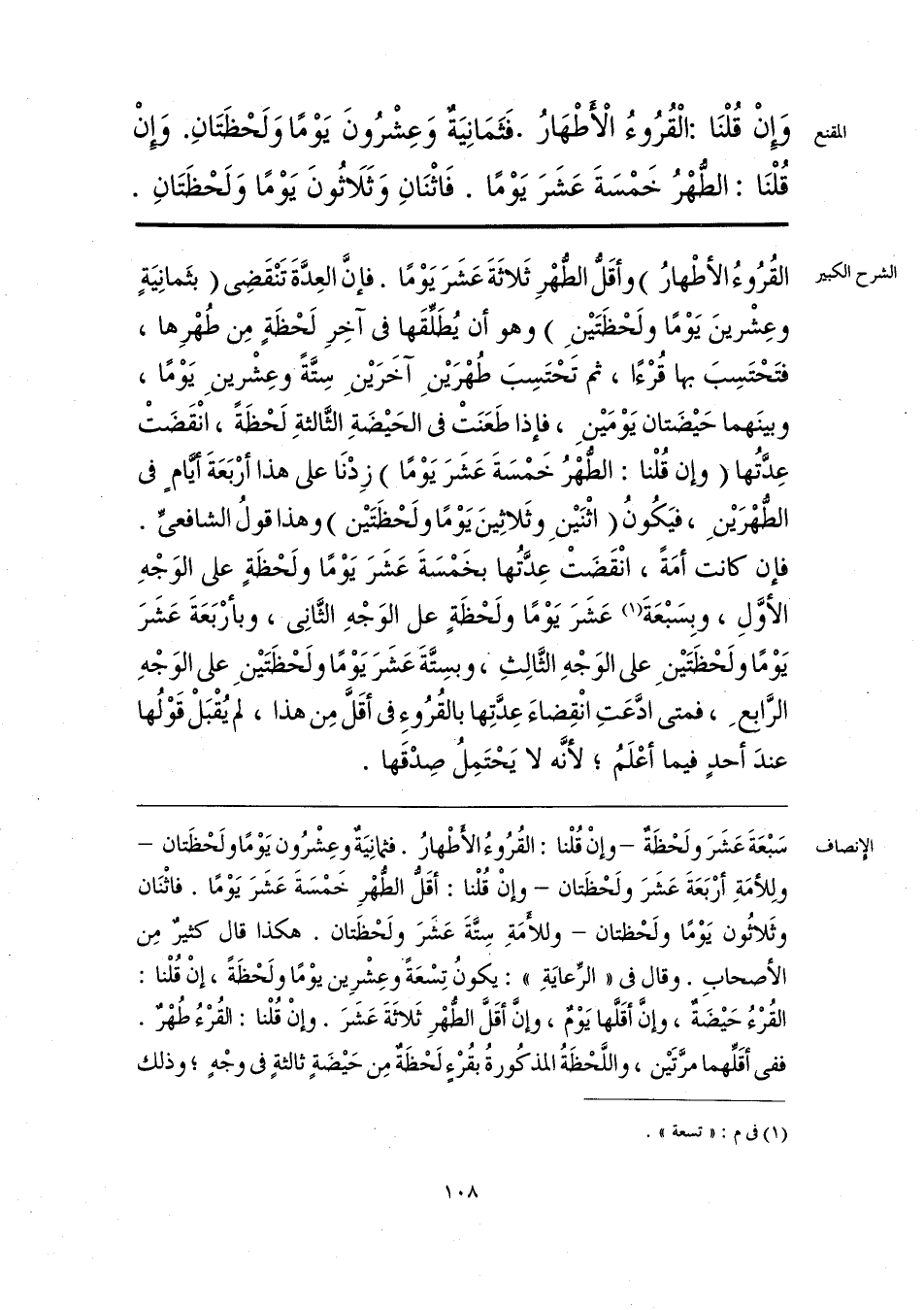 سَبْعَةَ عَشَرَ ولَحْظَةٌ- وإنْ قُلْنا: القُرُوءُ الأطْهارُ. فثمانِيَة وعِشْرُون يَوْمًا ولَحْطان -ولِلأمَةِ أرْبَعَةَ عَشَرَ ولَحْظَتان- وإنْ قُلْنا: أقَلُّ الطُّهْرِ خَمْسَةَ عَشَرَ يَوْمًا. فاثْنَان وثَلاثُون يَوْمًا ولَحْظتان- وللأَمةِ سِتَّةَ عَشَرَ ولَحْظَتان. هكذا قال كثيرٌ مِن الأصحابِ. وقال في «الرِّعايَةِ»: يكونُ تِسْعَةً وعِشْرِين يوْمًا ولَحْظَةً، إنْ قُلْنا: القُرْءُ حَيضَةٌ، وإنّ أقَلّها يَوْمٌ، وإنّ أقَلَّ الطُّهْرِ ثَلَاثَةَ عَشَرَ. وإنْ قُلْنا: القُرْءُ طُهْرٌ. ففي أقَلِّهما مرَّتَين، واللَّحْظَةُ المذكُورةُ بقُرْءٍ لَحْظَةٌ مِن حَيضَةٍ ثالثةٍ في وجْهٍ؛ وذلك
