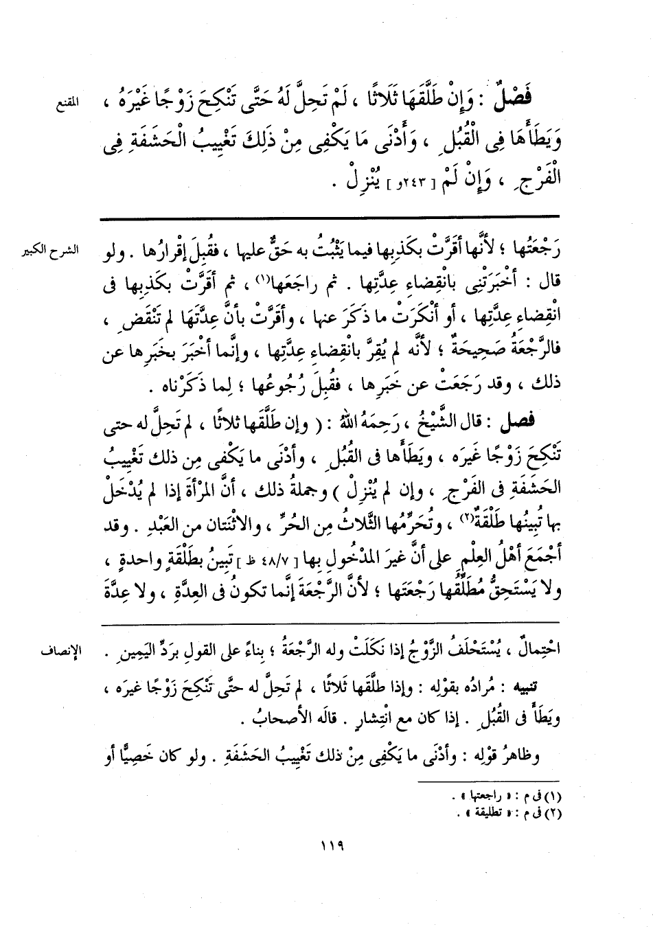 فَصْلٌ: وَإنْ طَلَّقَهَا ثَلَاثًا، لَمْ تَحِلَّ لَهُ حَتَّى تَنْكِحَ زَوْجًا غَيرَهُ، وَيَطَأَها في الْقُبُلِ، وَأَدْنَى مَا يَكْفِي مِنْ ذَلِكَ تَغْيِيبُ الْحَشَفَةِ في الْفَرجِ، وَإِنْ لَمْ يُنْزِلْ.