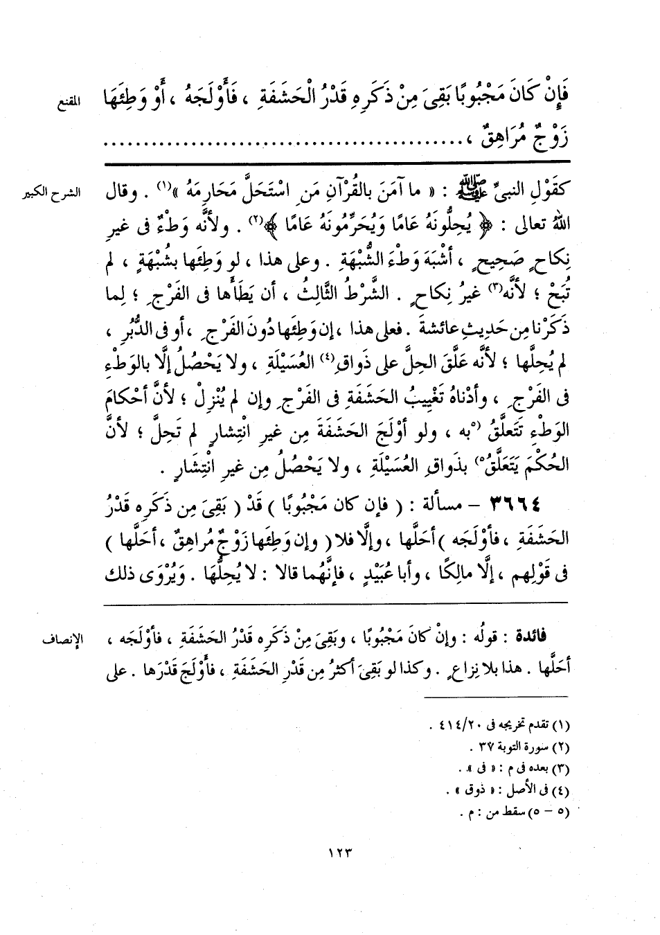 فائدة: قولُه: وإنْ كانَ مَجْبُوبًا، وبَقِيَ مِنْ ذَكَرِه قَدْرُ الحَشَفَةِ، فأوْلَجَه، أحَلَّها. هذا بلا نِزاعٍ. وكذا لو بَقِيَ أكثرُ مِن قَدْرِ الحَشَفَةِ، فأوْلَجَ قَدْرَها. على