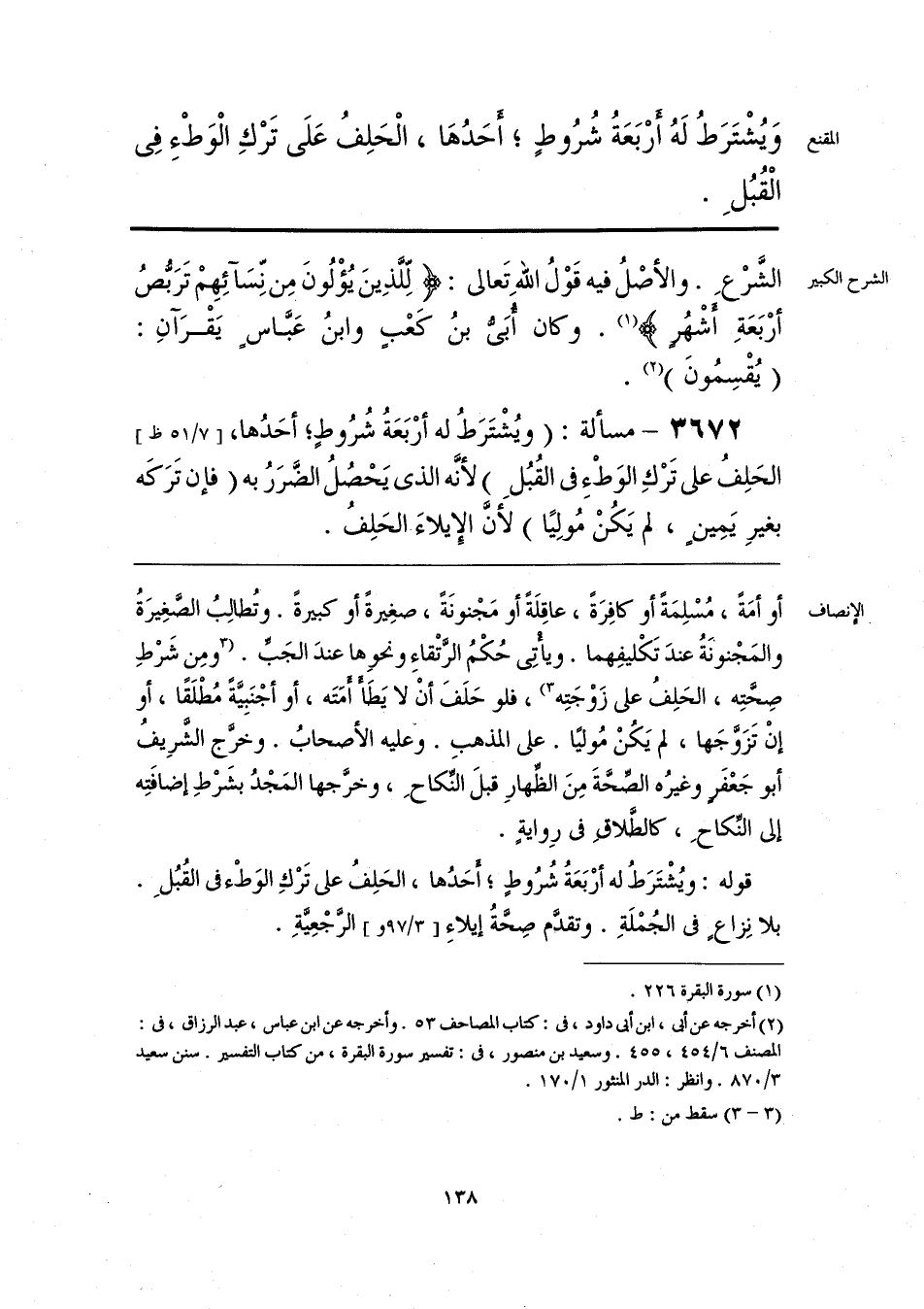 قوله: ويُشْتَرَطُ له أرْبَعَةُ شرُوطٍ؛ أحَدُها، الحَلِفُ على تَرْكِ الوَطْء في القُبُلِ. بلا نِزاعٍ في الجُمْلَةِ. وتقدَّم صِحَّةُ إيلاءِ الرَّجْعِيَّةِ.